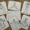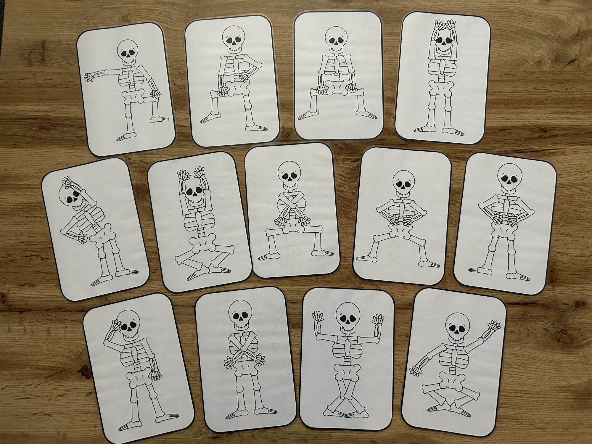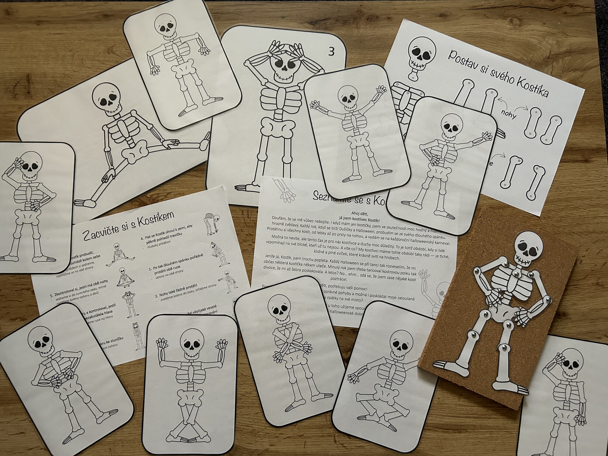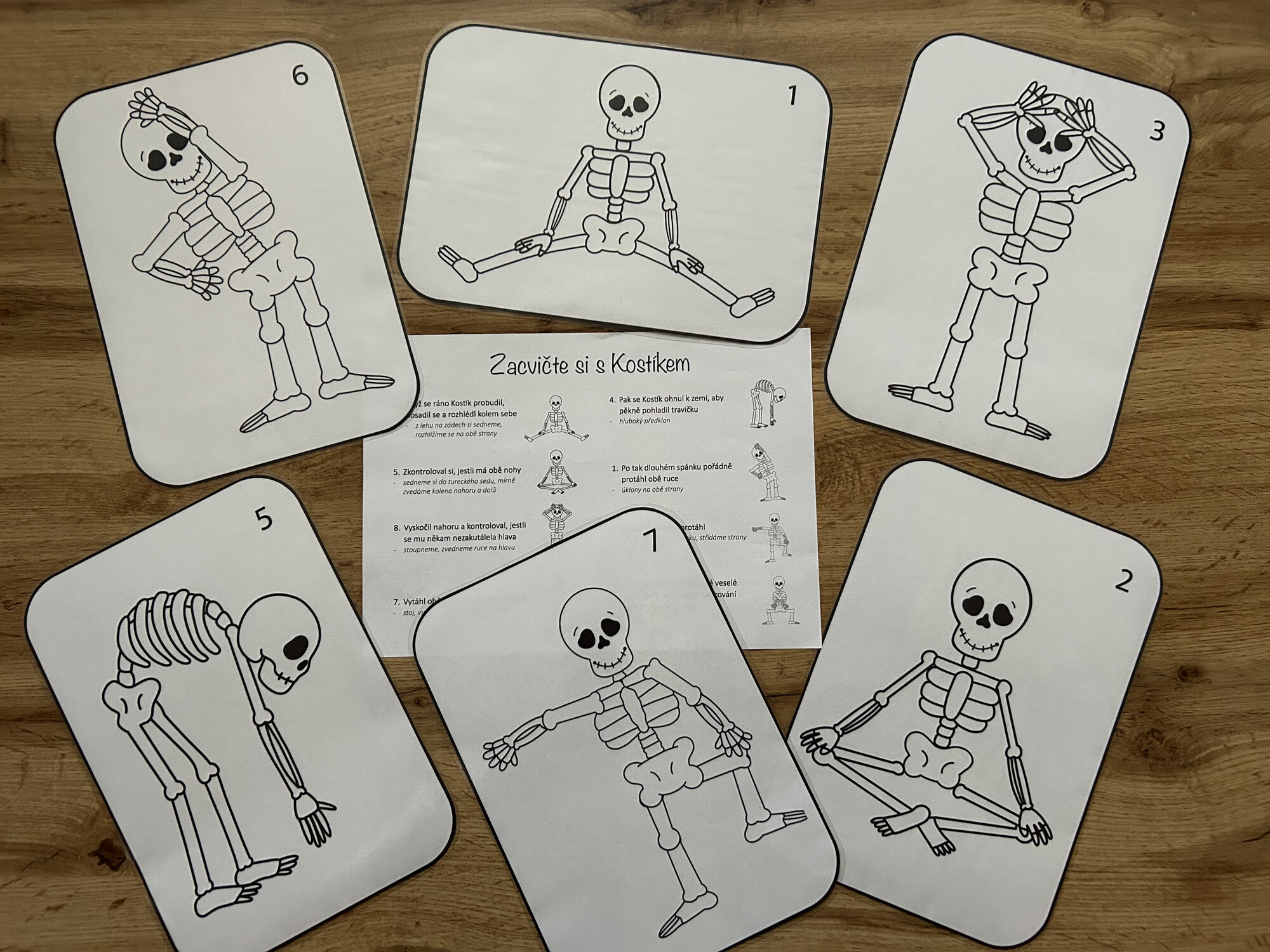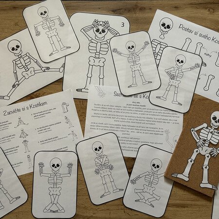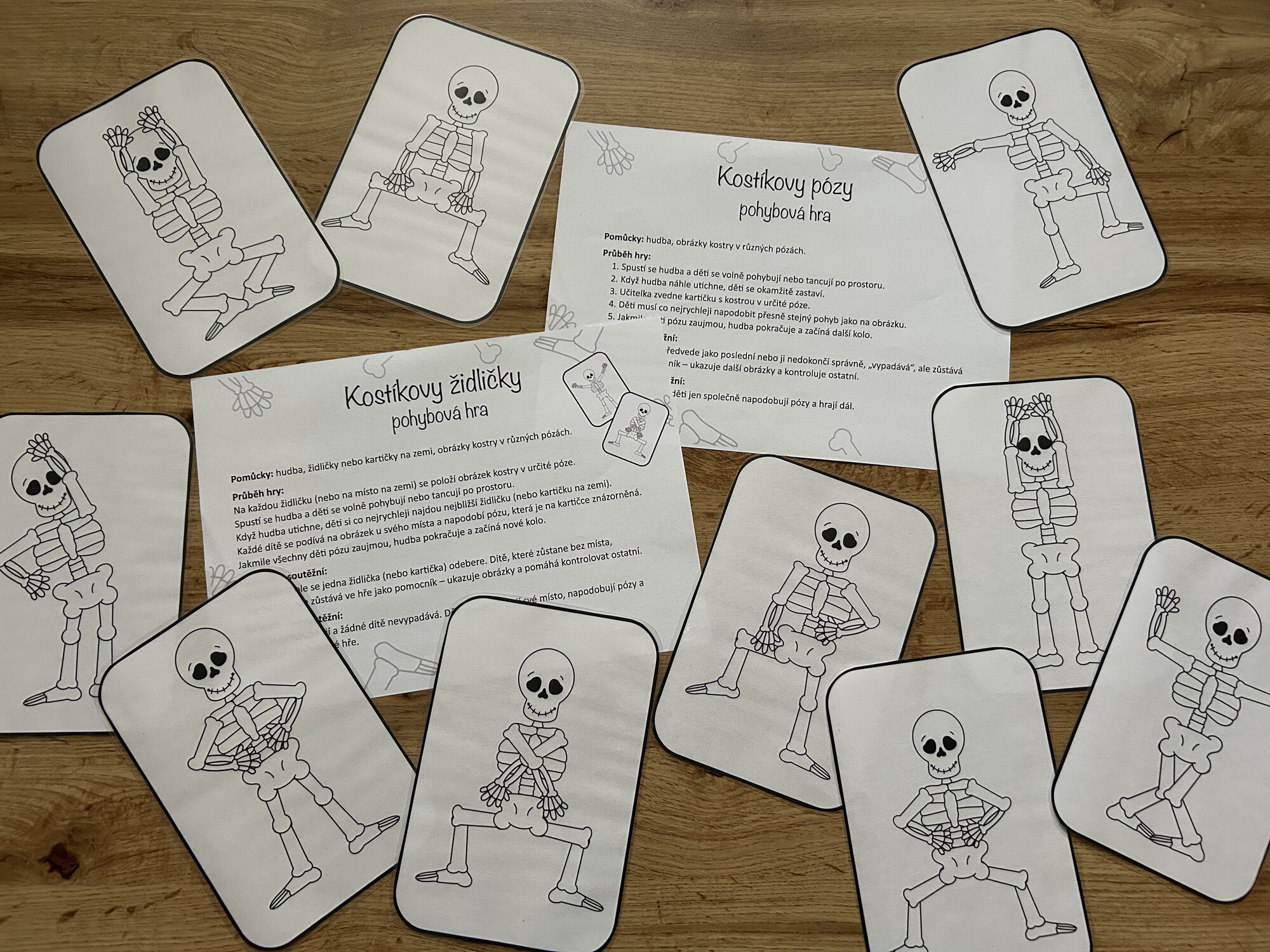 - Karty ve velikosti A4 – ilustrace kostry v různých pózách pro pohybové napodobování.