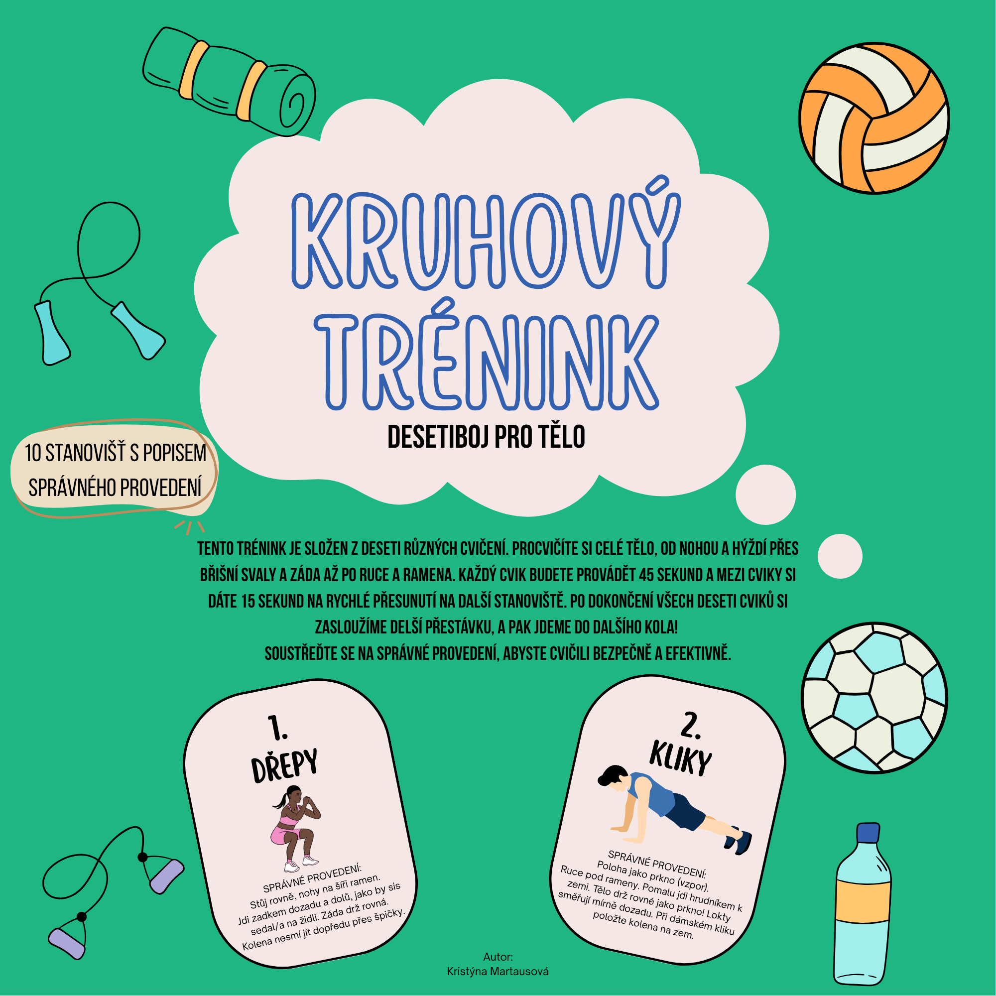 Materiál obsahuje 10 stanovišť s cviky s vlastní vahou, které procvičí celé tělo. Každý cvik je detailně popsán pro správné a bezpečné provedení!