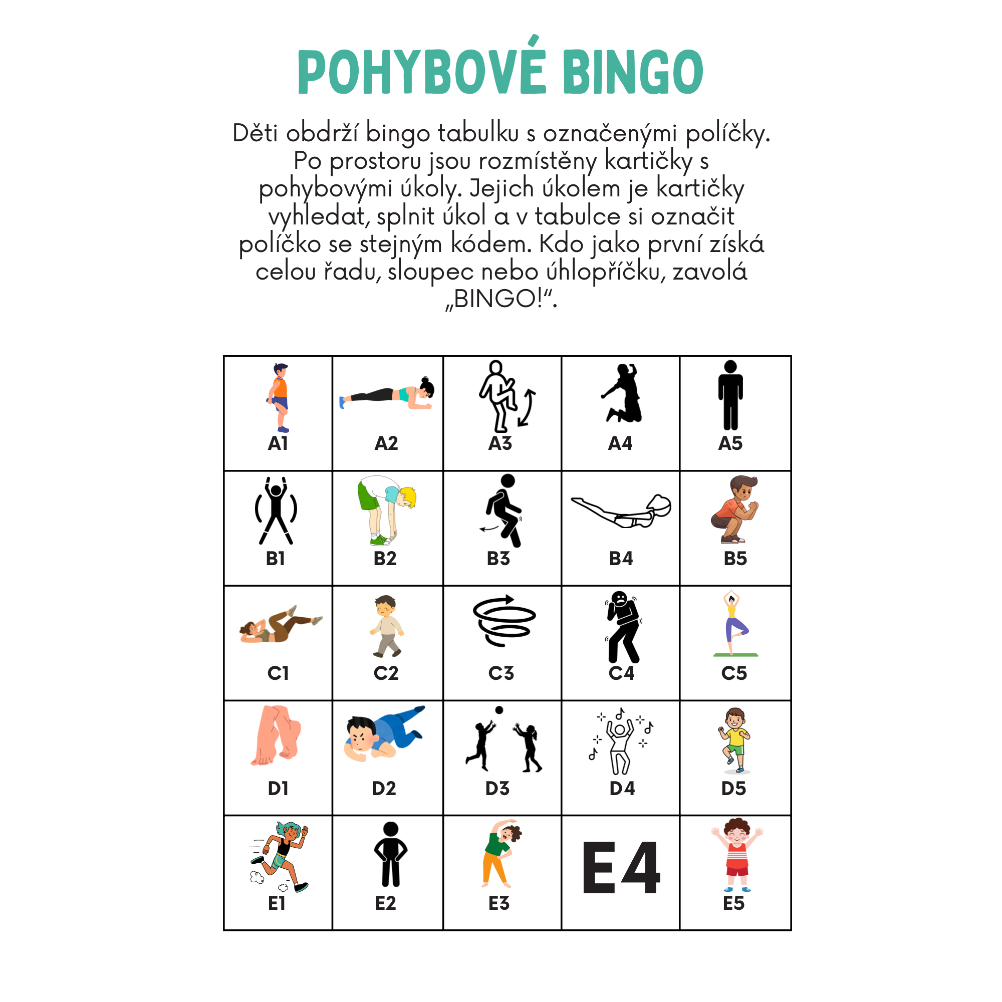 "Rozhýbej Tělo: Bingo Výzva" – sadu 25 zábavných pohybových úkolů vytvořených přímo pro děti na ZŠ!