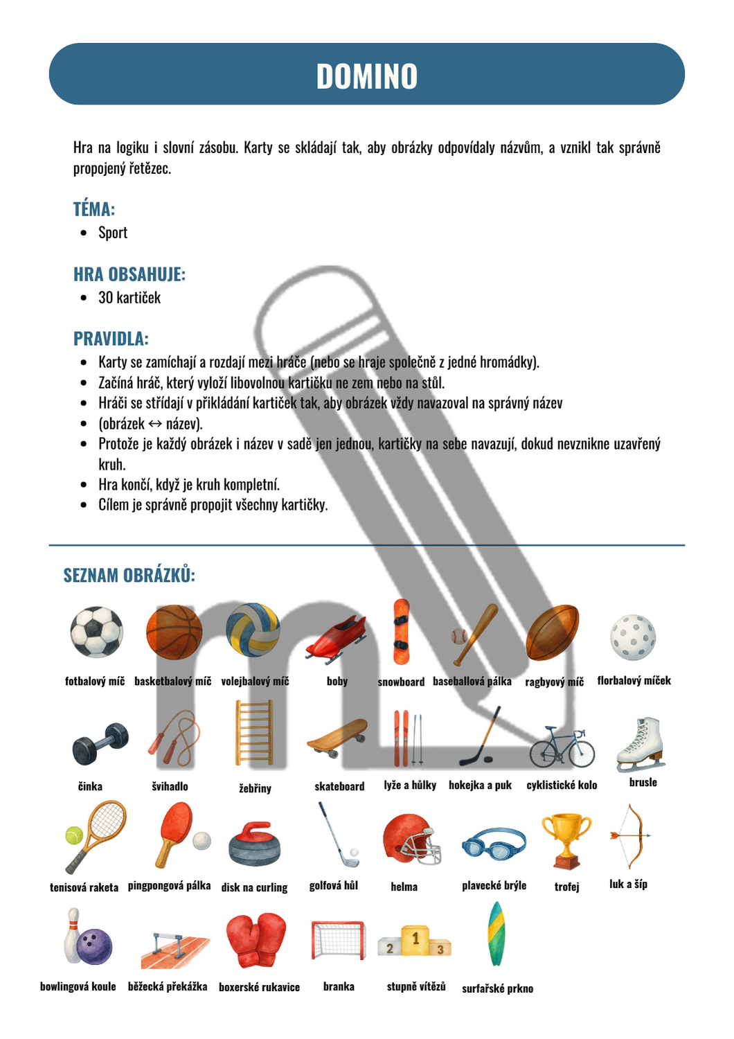 Hra na logiku i slovní zásobu. Karty se skládají tak, aby obrázky odpovídaly názvům, a vznikl tak správně propojený řetězec.