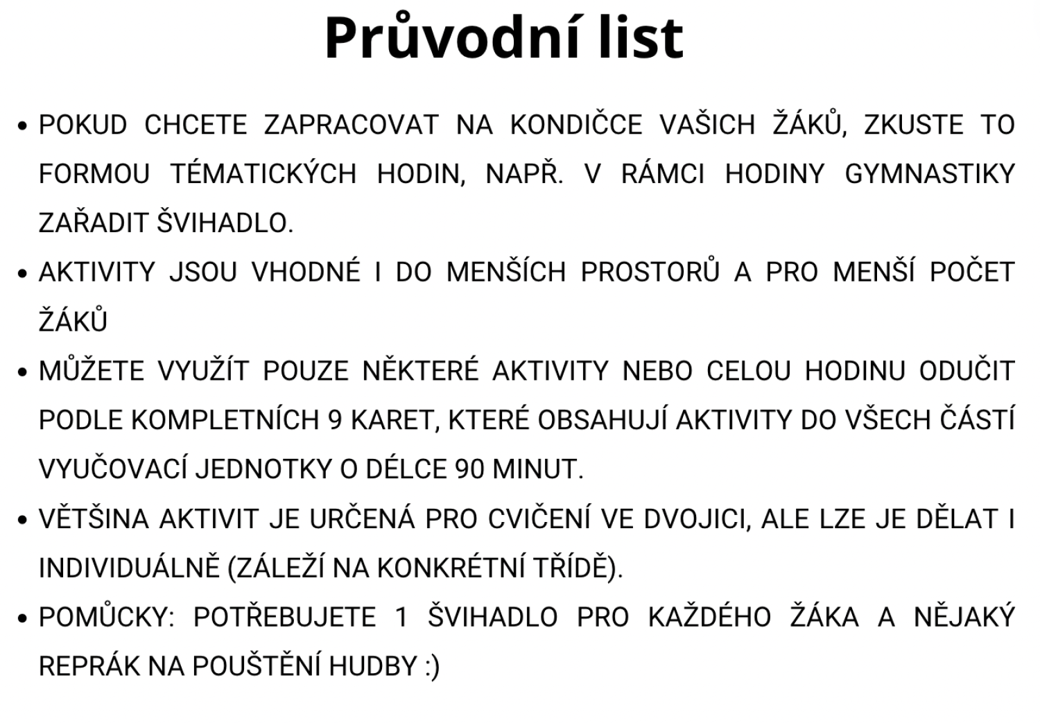 Materiál obsahuje 9 aktivit a her se švihadlem do úvodní (rušné i průpravné části), hlavní (5 her a aktivit) a závěrečné části (posilování a protahování se švihadlem).