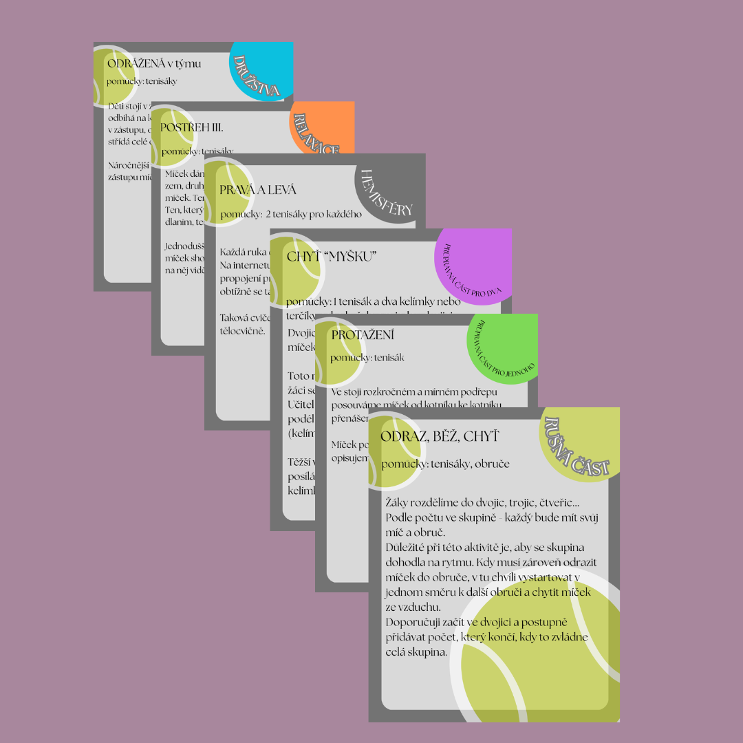 Tenhle soubor obsahuje 40 přehledných karet s aktivitami, které rozvíjí obratnost, koordinaci, spolupráci i rychlost reakce – a vystačíte téměř jen s tenisovými míčky.