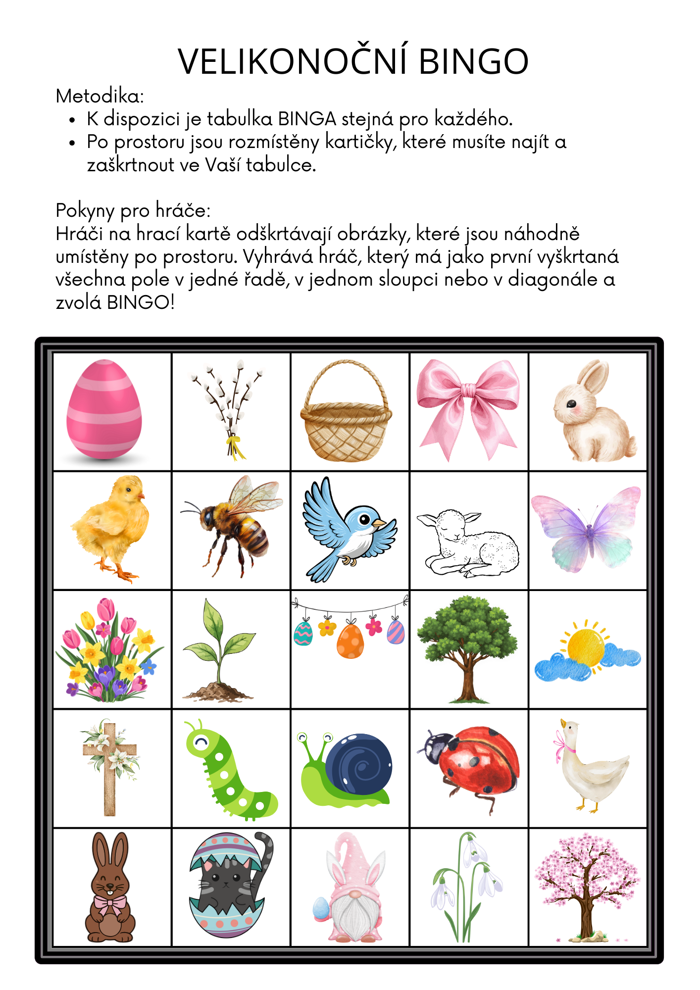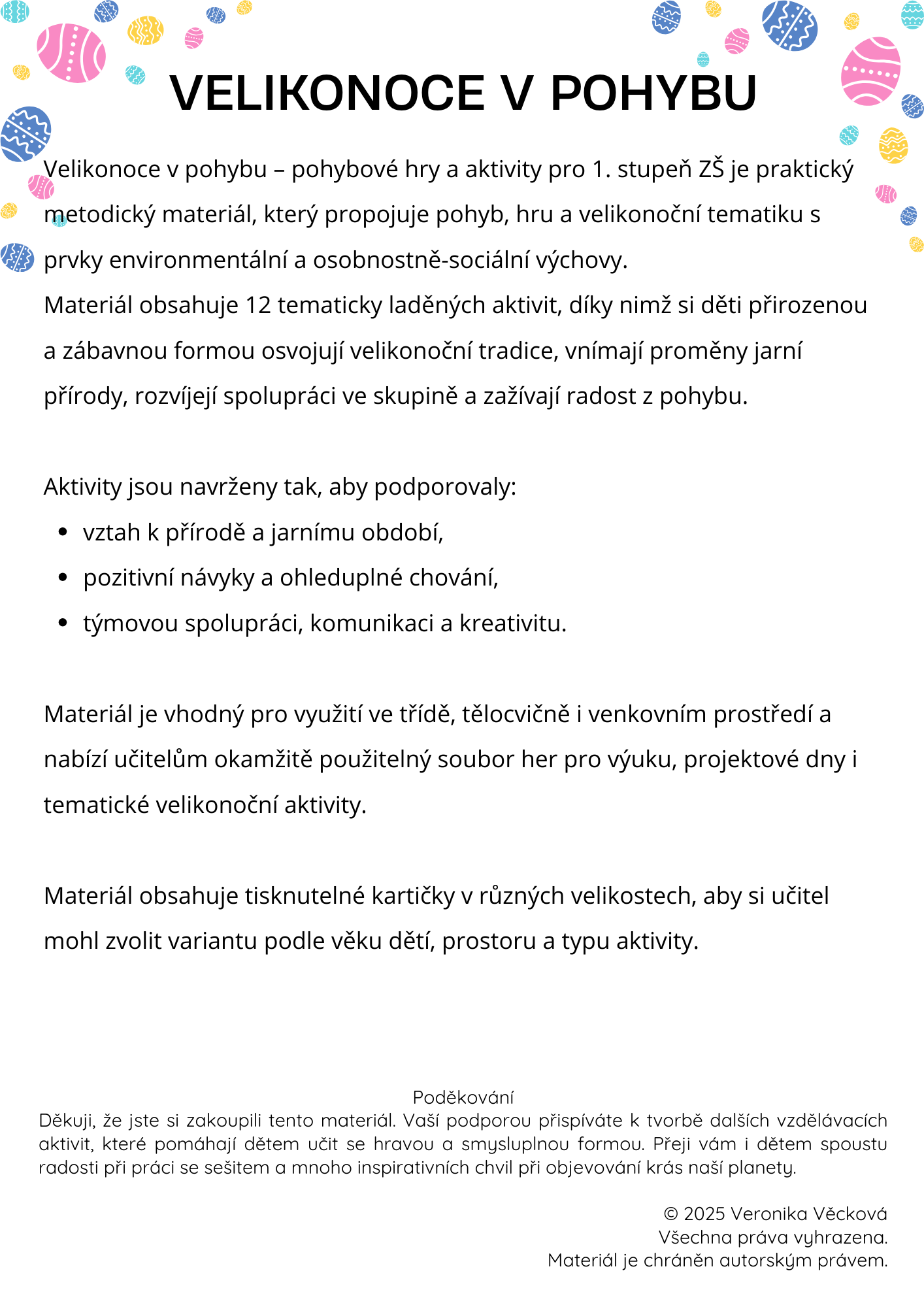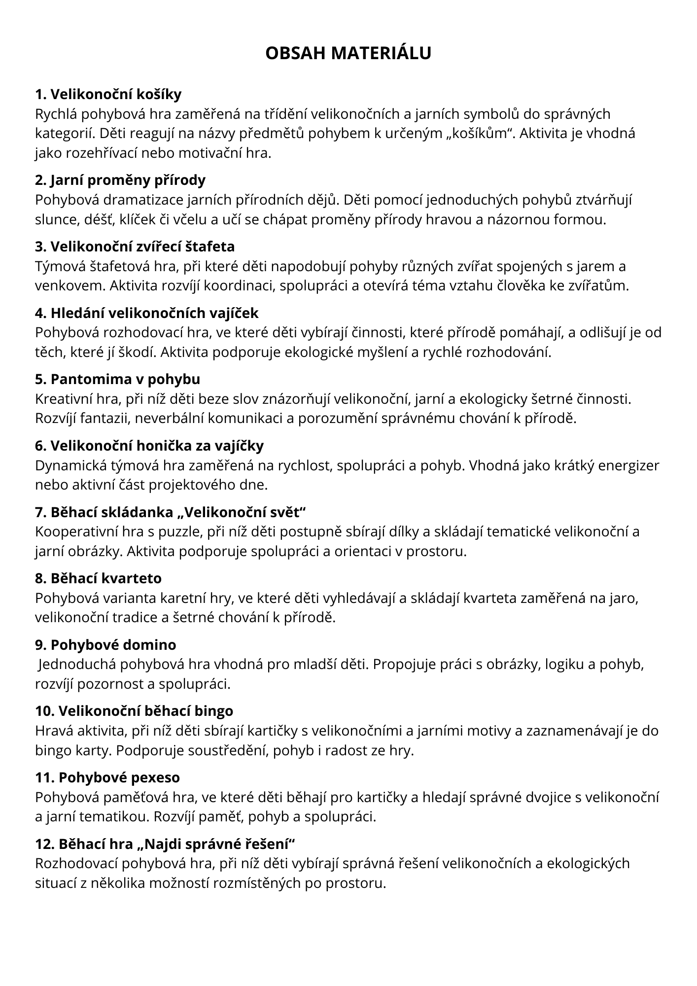 Materiál obsahuje 12 tematicky laděných aktivit, díky nimž si děti přirozenou a zábavnou formou osvojují velikonoční tradice, vnímají proměny jarní přírody, rozvíjejí spolupráci ve skupině a zažívají radost z pohybu.