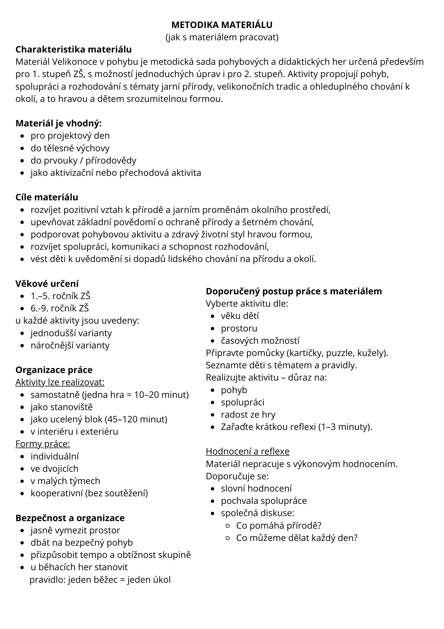 Materiál je vhodný pro využití ve třídě, tělocvičně i venkovním prostředí a nabízí učitelům okamžitě použitelný soubor her pro výuku, projektové dny i tematické velikonoční aktivity.