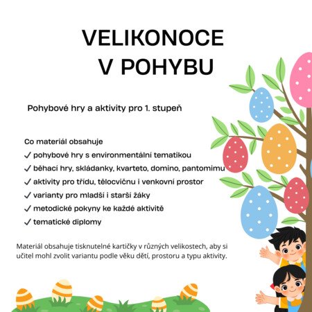Velikonoce v pohybu – pohybové hry a aktivity pro 1. stupeň ZŠ je praktický metodický materiál, který propojuje pohyb, hru a velikonoční tematiku s prvky environmentální a osobnostně-sociální výchovy.