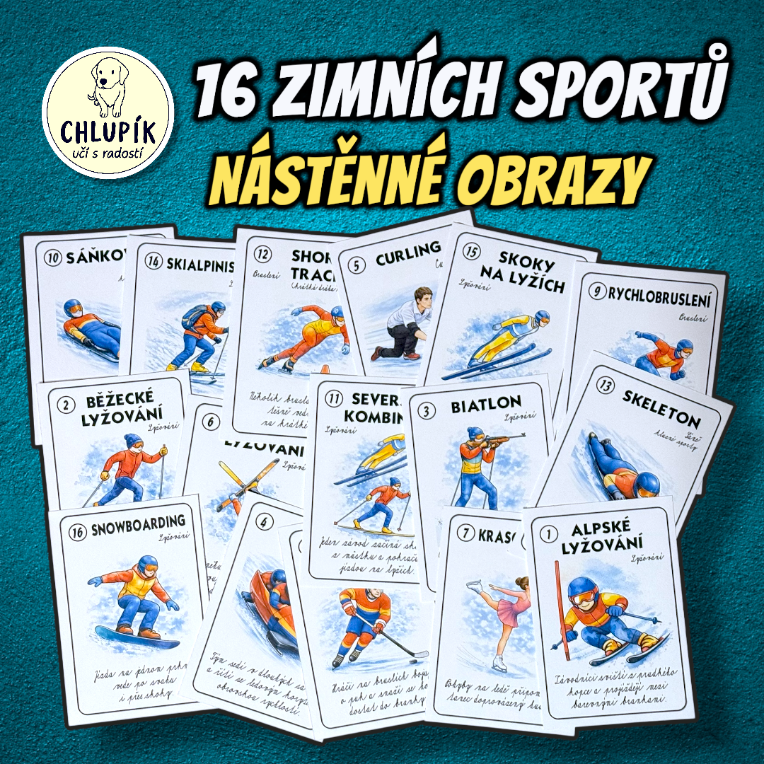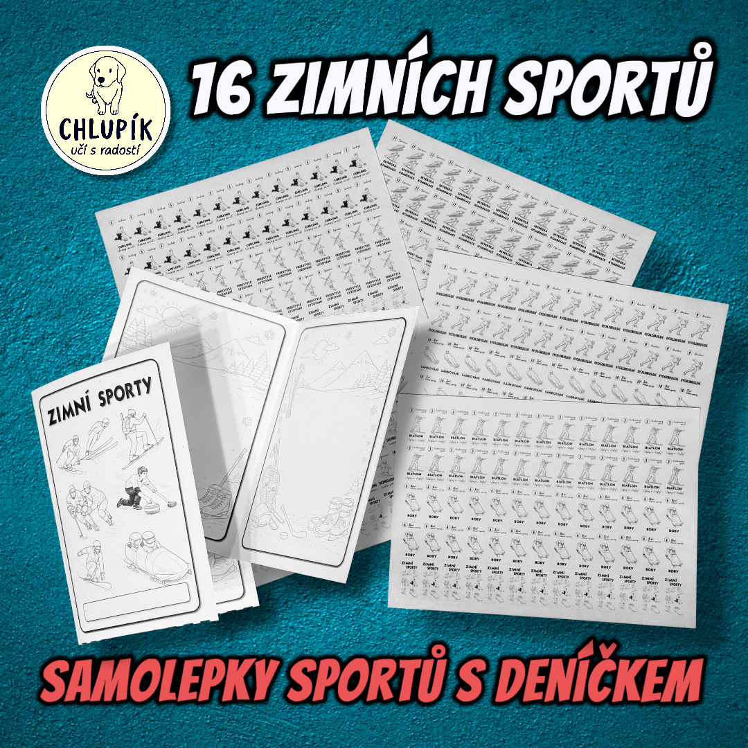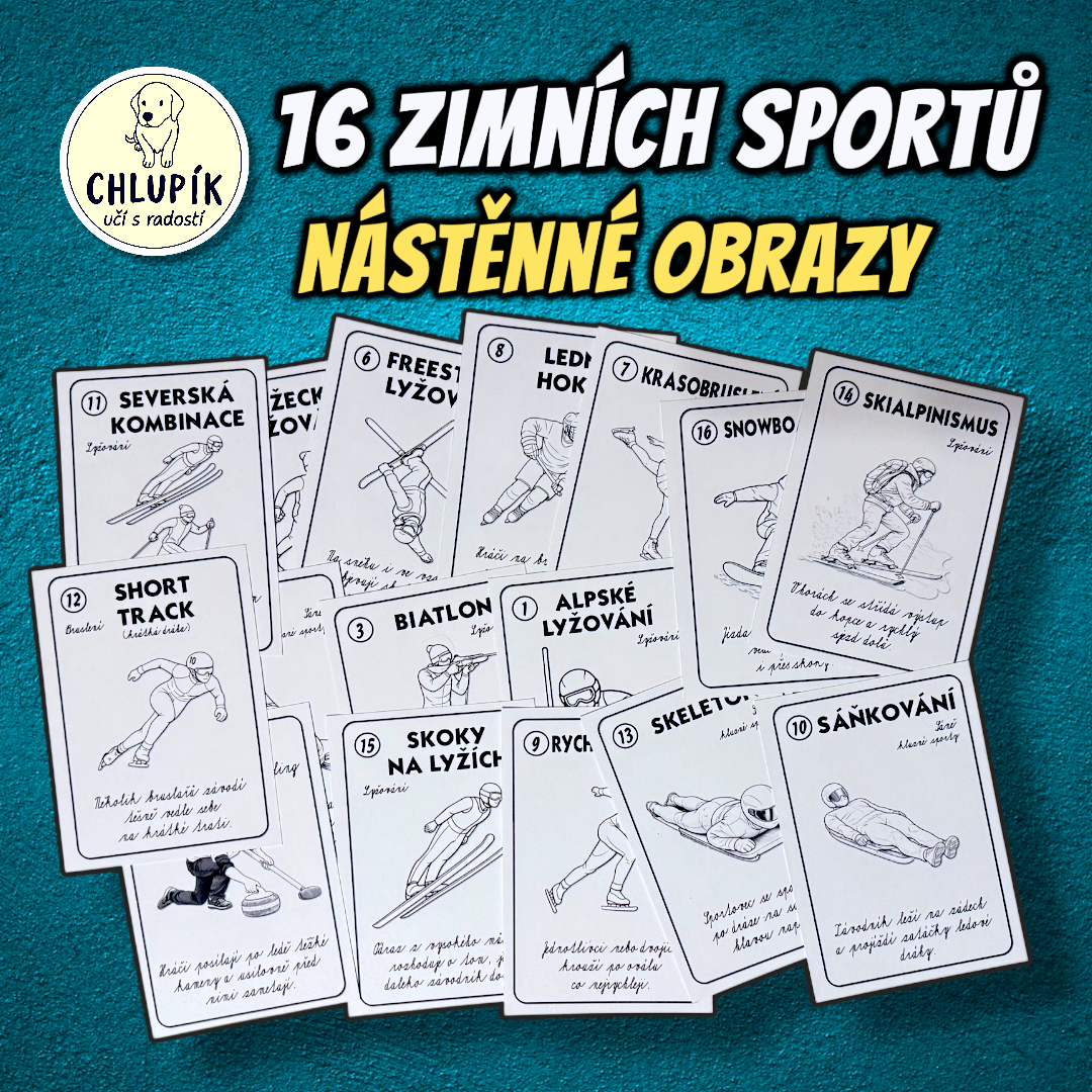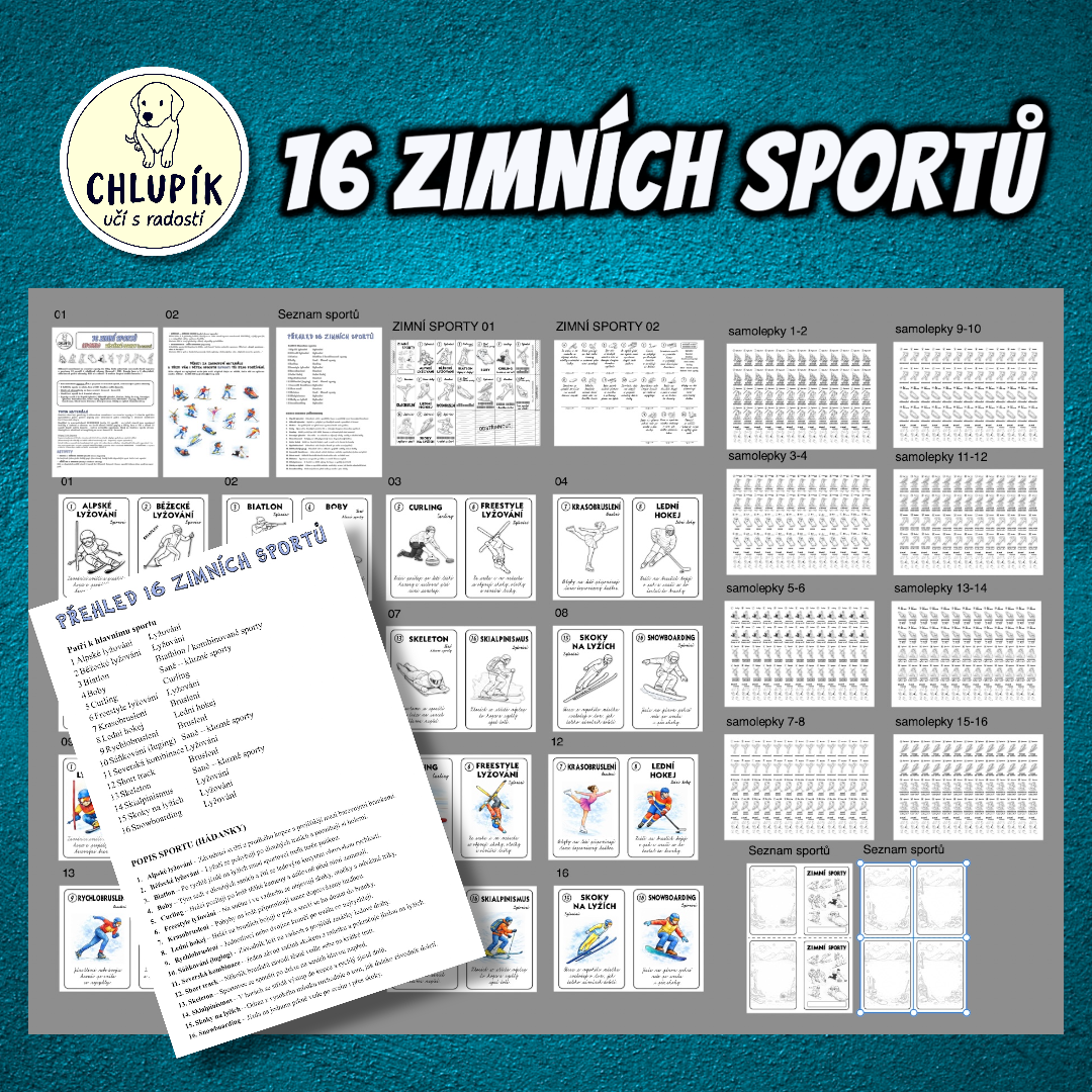 Zábavné seznámení se zimními sporty. Sada obsahuje leporelo s popisem 16 sportů, nástěnné obrazy (barevné i ČB) a i samolepky s deníčkem. Sporty jsou v 7 skupinách, očíslované podle abecedy. Děti si u všech 16 mohou dopsat svého favorita.