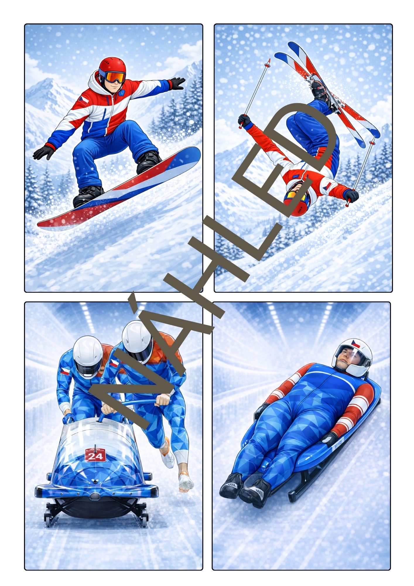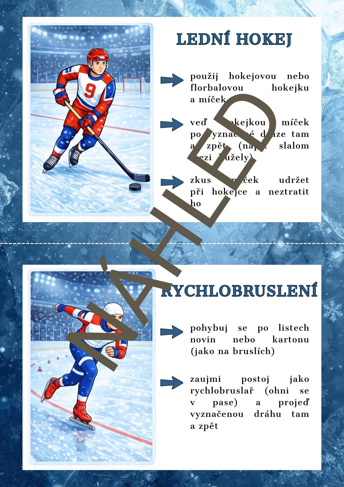 - obrázky sportovců typických zimních sportů doplněné o jednoduché pohybové úkoly