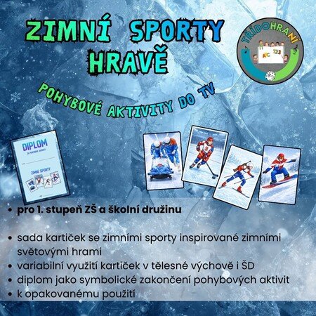 Materiál pro 1. stupeň ZŠ i ŠD nabízí sadu kartiček se zimními sporty inspirované zimními světovými hrami (soubor je využitelný kdykoliv v zimním období) a doplněné o jednoduché pohybové úkoly vhodné do tělocvičny. Aktivity lze zpestřit hravou variantou, kdy děti plní úkoly ve vlastní čepici a šále. Kartičky lze využít také ke štafetovému přiřazování názvů sportů k obrázkům a nabízí tak variabilní využití.
