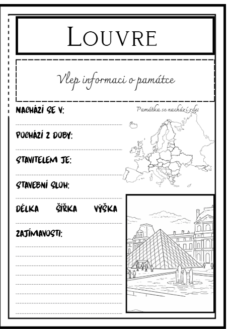 - 30 přehledných šablon (pracovních listů): Každý list je věnován jedné konkrétní památce (např. Stonehenge, Big Ben, Karlštejn, Louvre, Malbork, kláštery Meteora, Koloseum, Batalha a mnoho dalších).
