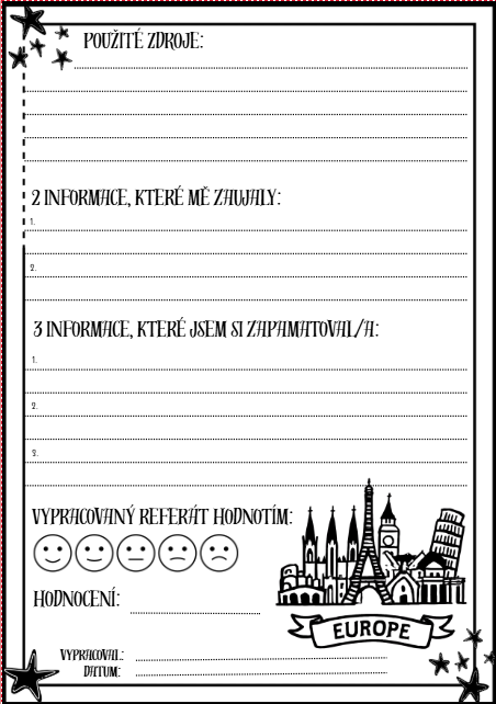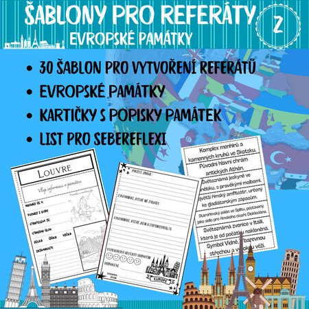 Tento komplexní materiál obsahuje 30 připravených šablon pro referáty a informační karty k nejznámějším evropským památkám. Žáci pracují s textem, mapou i vlastní kreativitou.