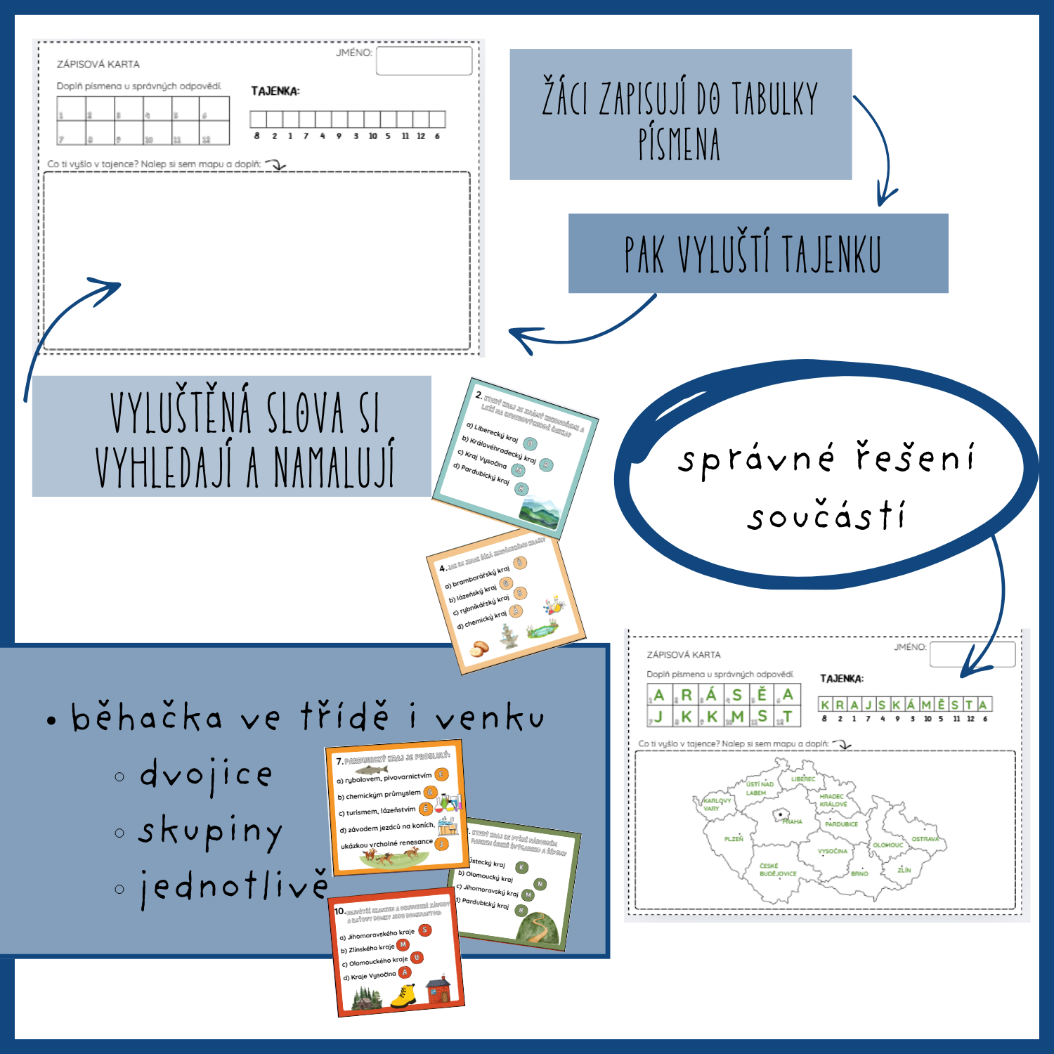 Žáci běhají, čtou, vybírají správné odpovědi a zapisují je do karty. Po vyluštění tajenky zjistí, jaké slovní spojení se skrývá za jejich snahou! Poté dostanou od učitele mapu ČR, kterou si dolepí na vyhrazené místo v zápisové kartě a dopíší krajská města (= tajenka) k tečkám do mapy.