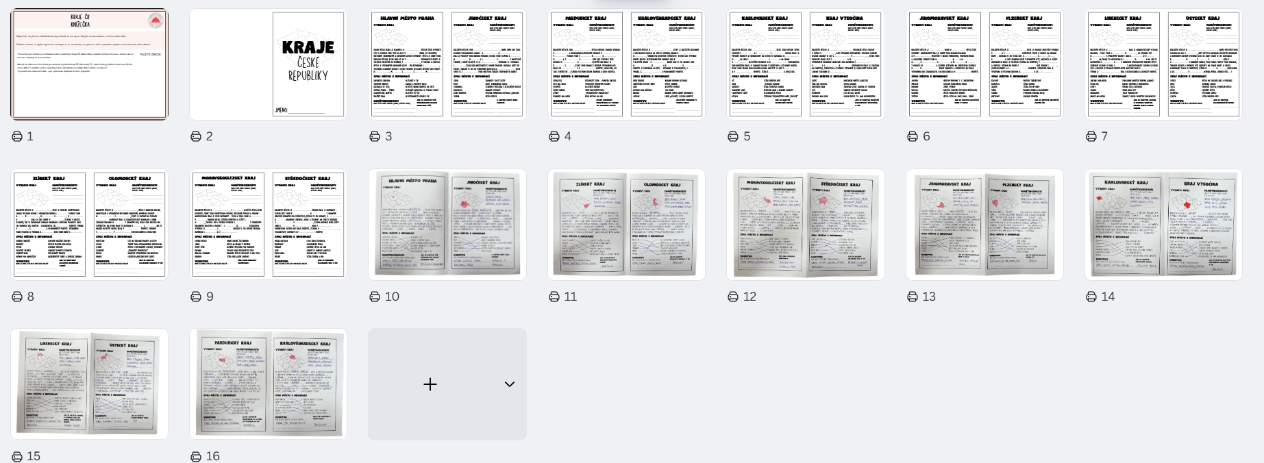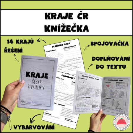 Materiál má celkem osm stran, které jsou zaměřené na jednotlivé kraje ČR (dohromady 14) + řešení. Vhodné je tisknout oboustranně (kratší strana, šířka). Po přeložení vznikne z jednotlivých listů malá knížečka pro každého žáka (můžete i secvaknout).