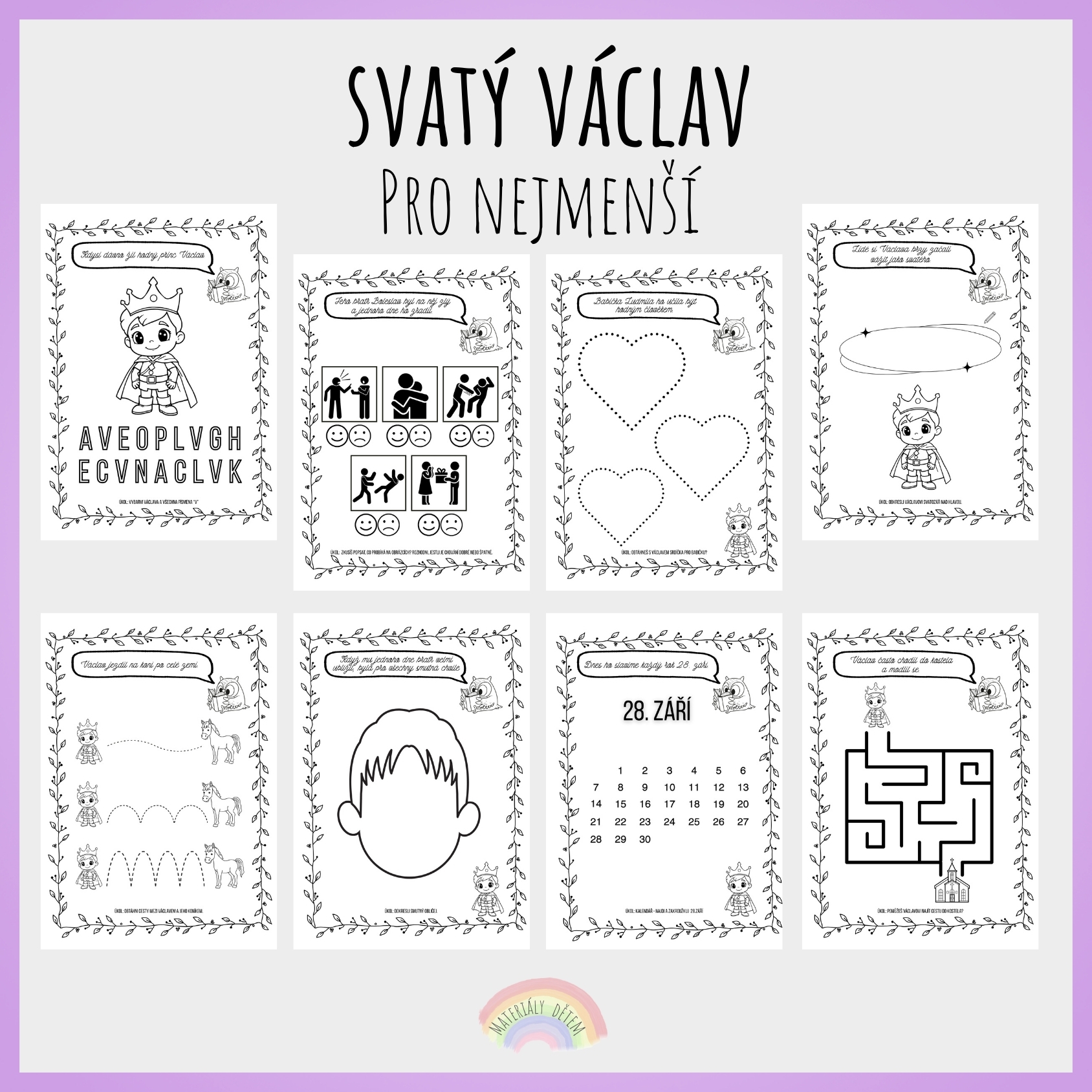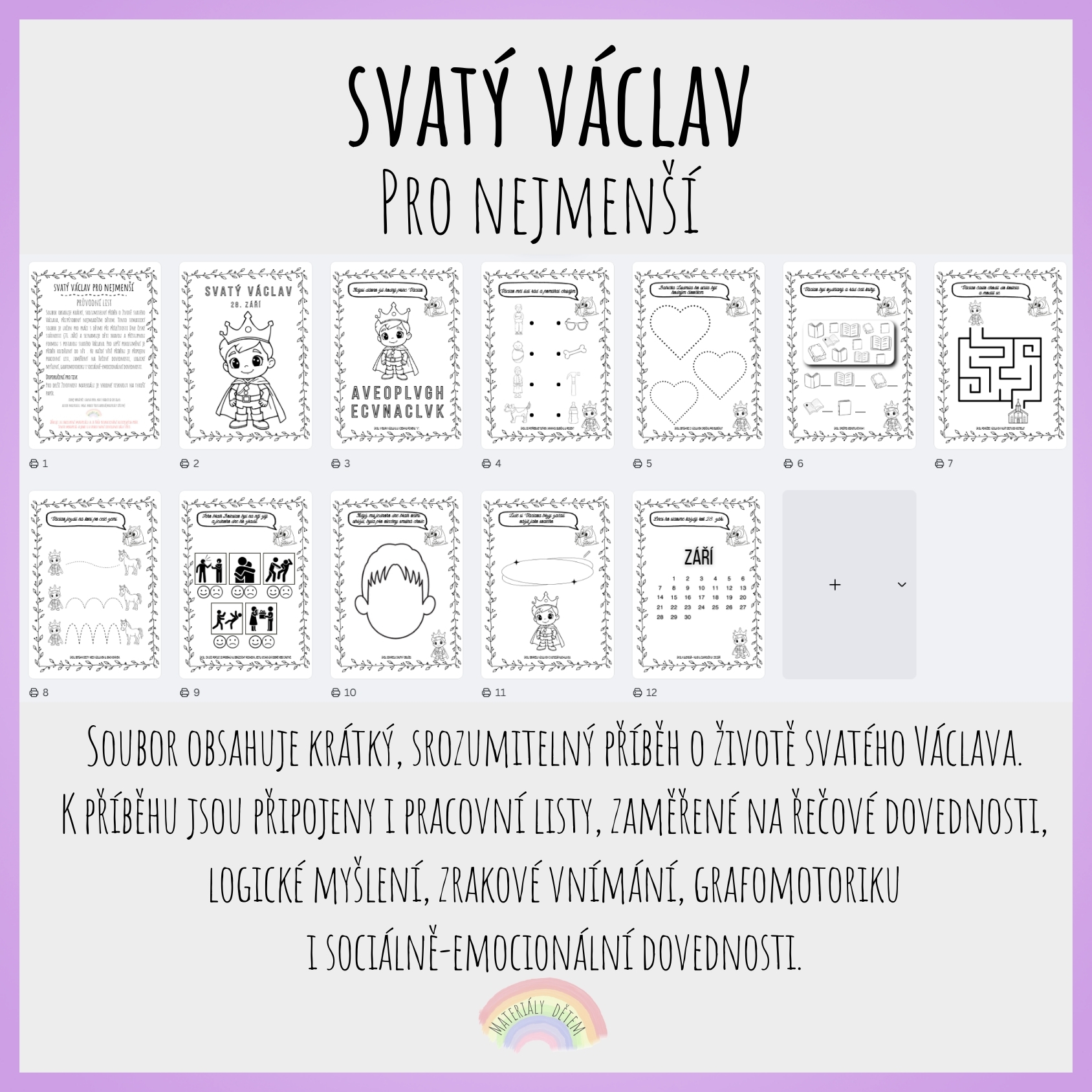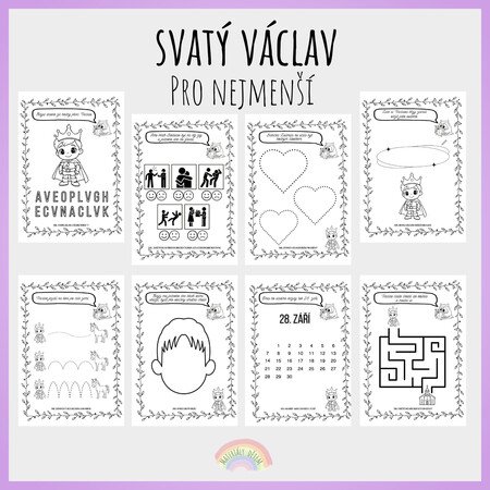 Soubor obsahuje krátký, srozumitelný příběh o životě svatého Václava, přizpůsobený nejmladším dětem. Tento tematický soubor je určen pro práci s dětmi při příležitosti Dne české státnosti (28. září) a seznamuje děti hravou a přístupnou formou s postavou svatého Václava. Pro lepší porozumění je příběh rozdělený do vět . Ke každé větě příběhu je připojen pracovní list, zaměřený na řečové dovednosti, logické myšlení, grafomotoriku i sociálně-emocionální dovednosti.