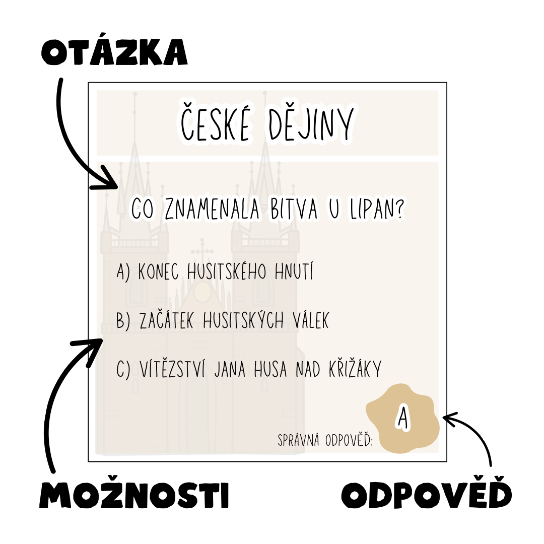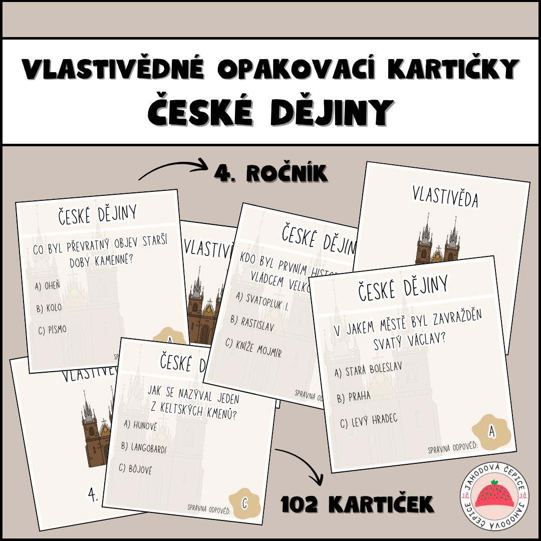 102 kartiček pro opakování a procvičování učiva vlastivědy - HLAVNÍ UDÁLOSTI NEJSTRAŠÍCH ČESKÝCH DĚJIN formou výběru z možností A, B, C.