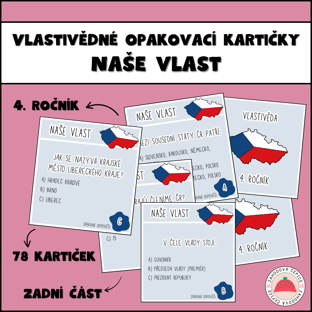 78 kartiček pro opakování a procvičování učiva vlastivědy - POZNÁVÁME NAŠI VLAST formou výběru z možností A, B, C.