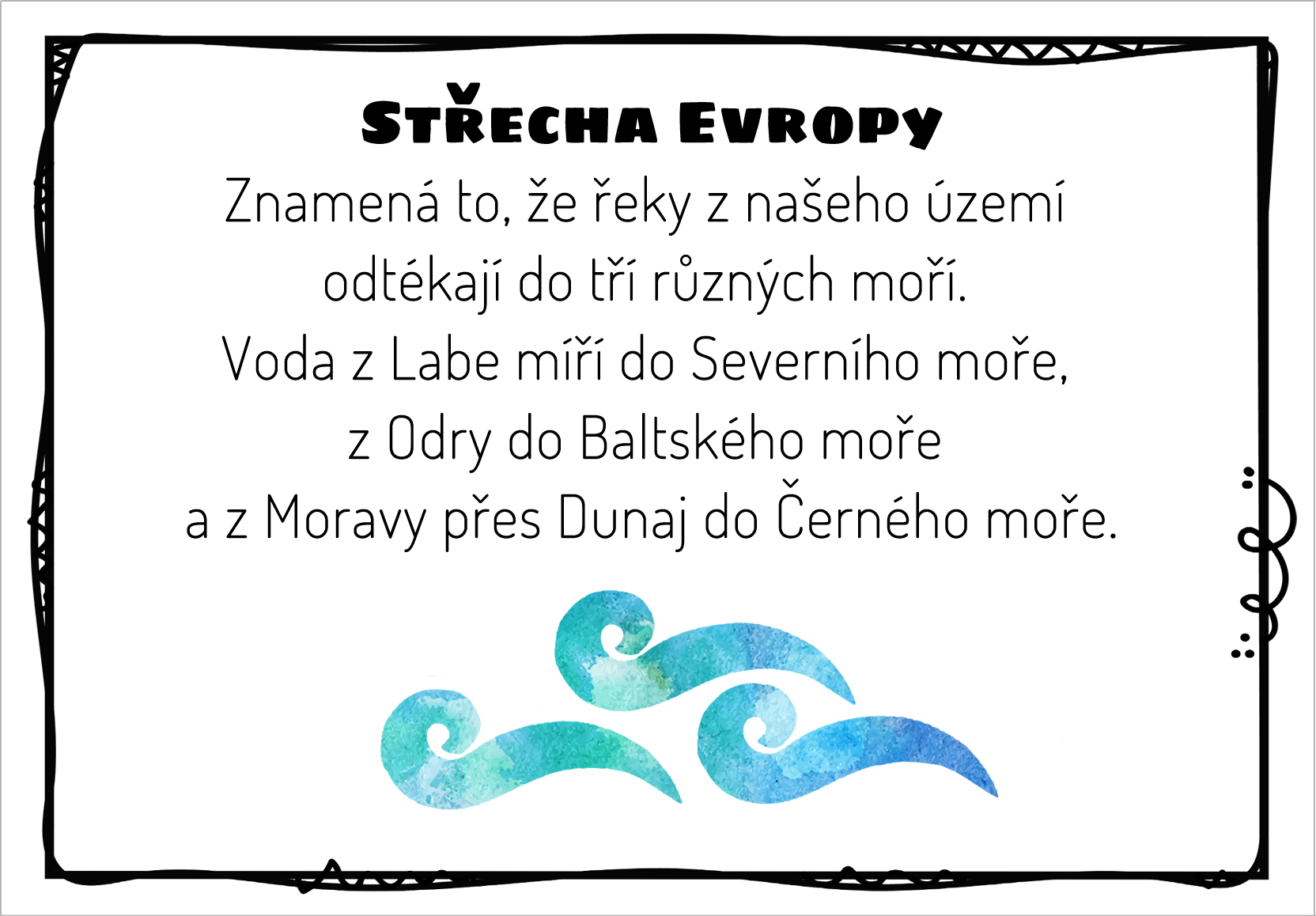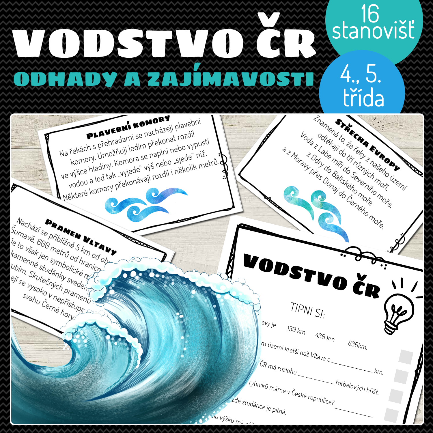 Žáci si tipují odpovědi na 8 otázek o vodstvu ČR (řeky, rybníky, jezera, přehrady, vodopády atd.). Následně hledají odpovědi na tyto otázky na kartičkách, které jsou rozmístěné po třídě.