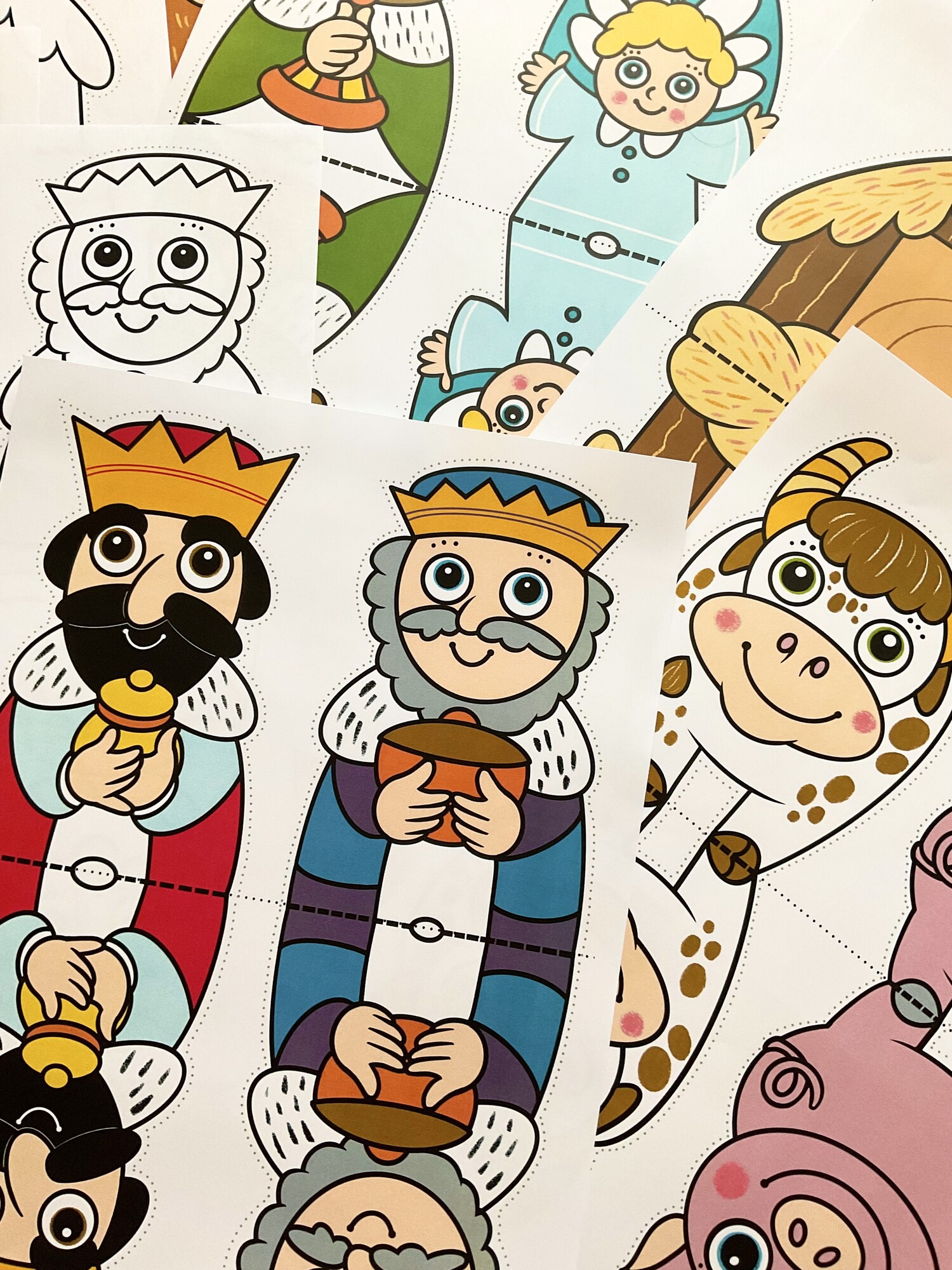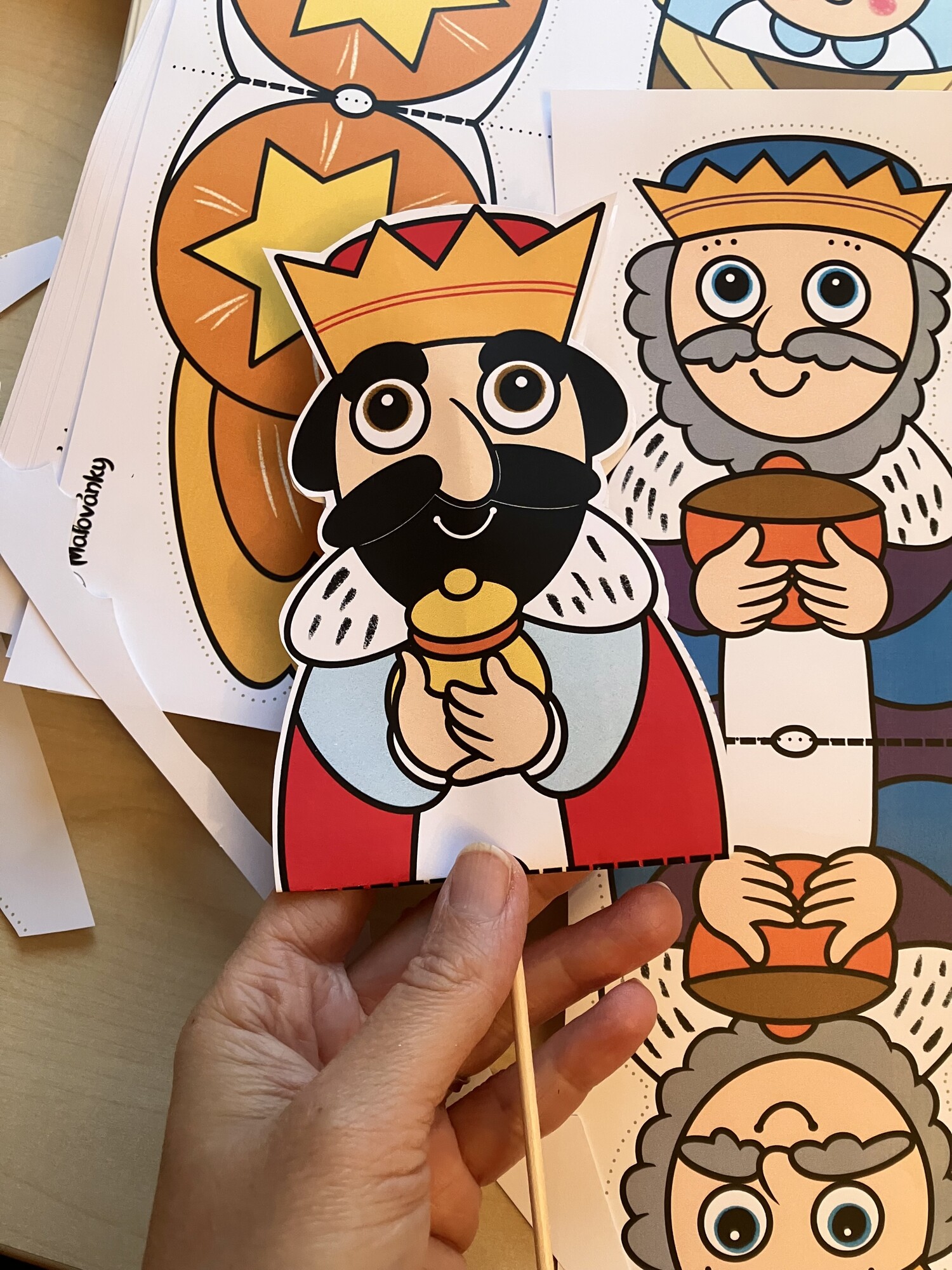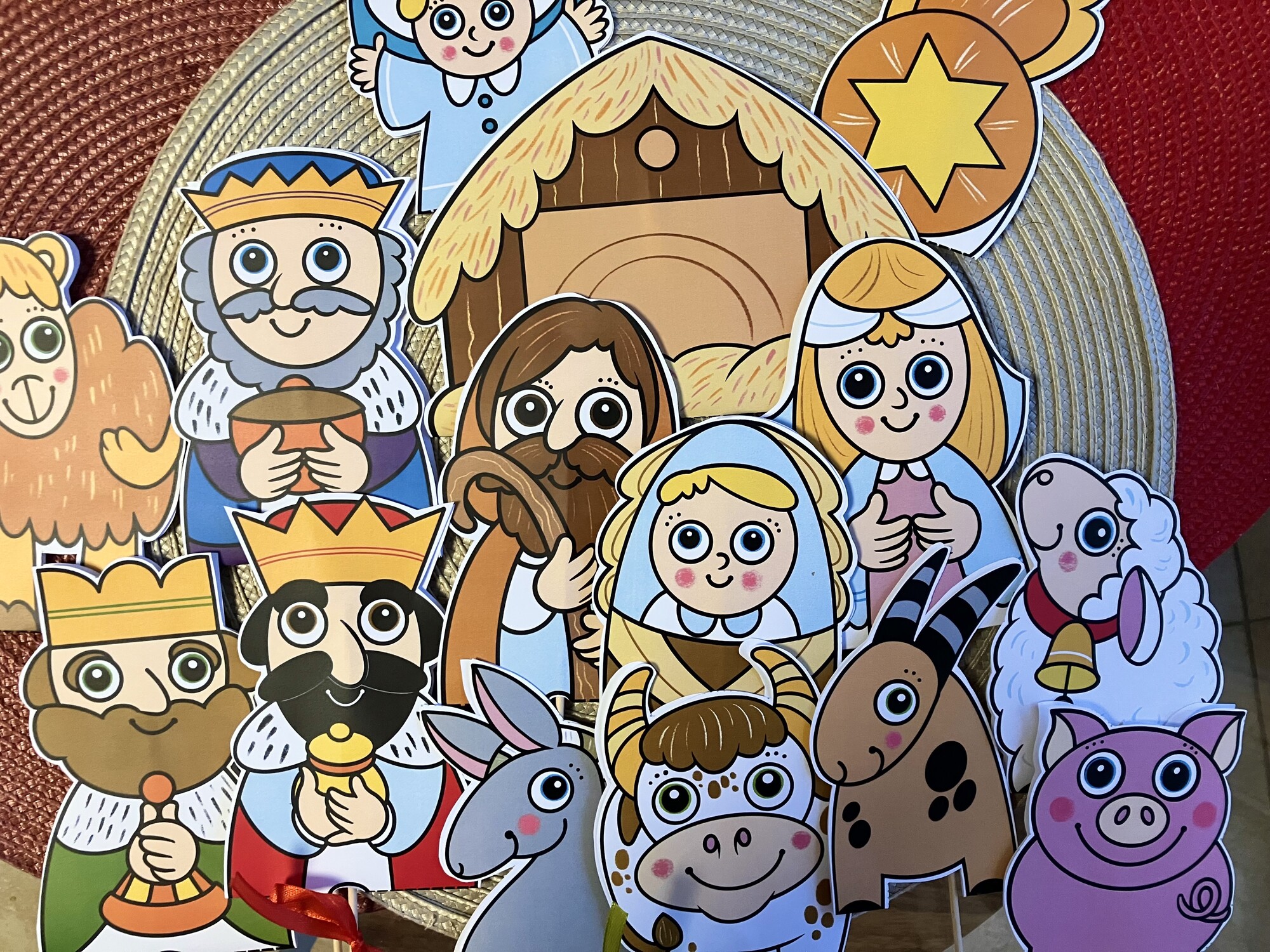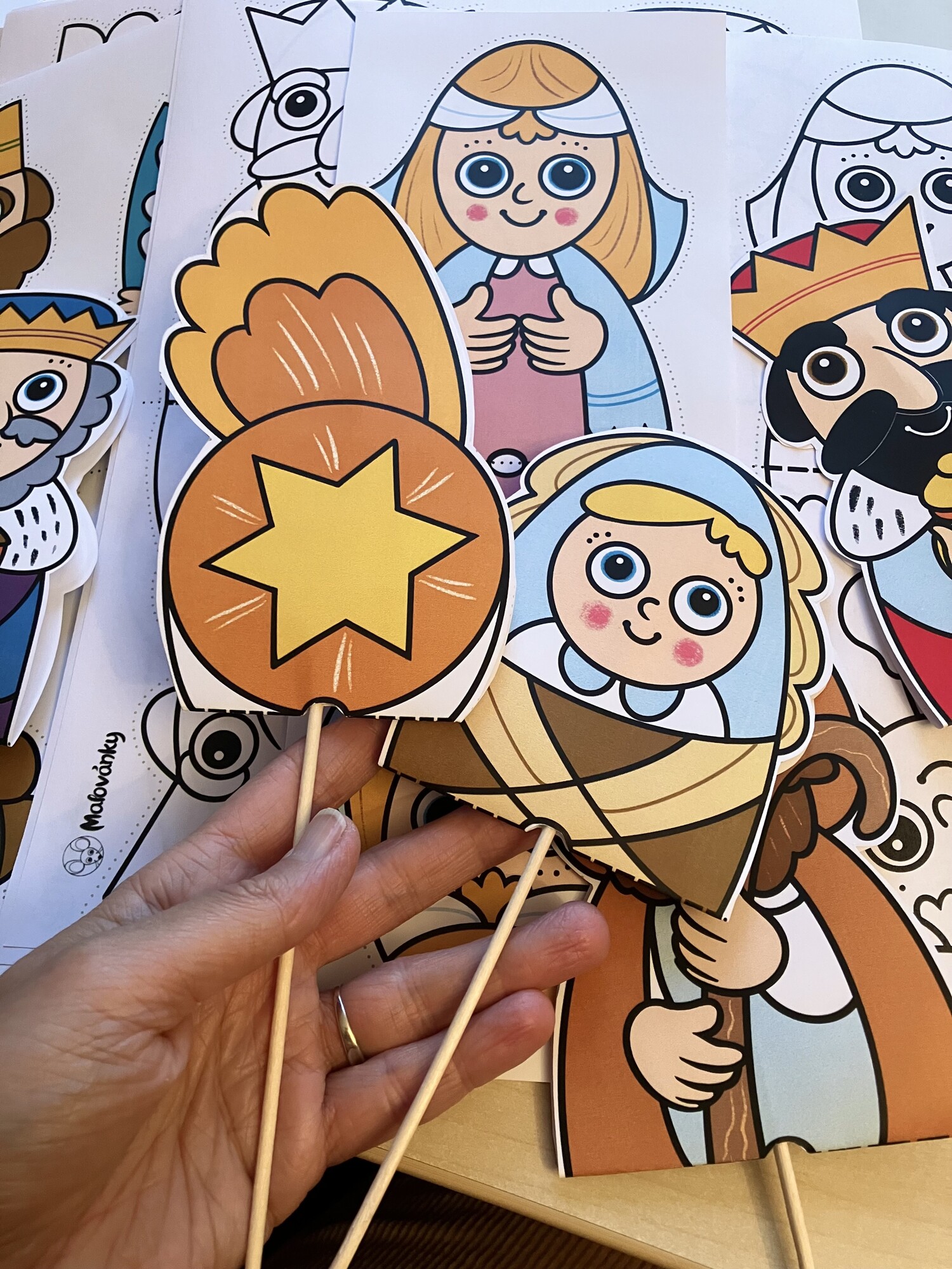 Kolekce obrázků je vhodná pro předškolní děti nebo nejmladší školáky. Děti si lehce vytvoří pěknou dekoraci k adventnímu období v podobě postav z Betléma. Pro práci budou potřebovat jen nůžky, lepidlo a špejle.