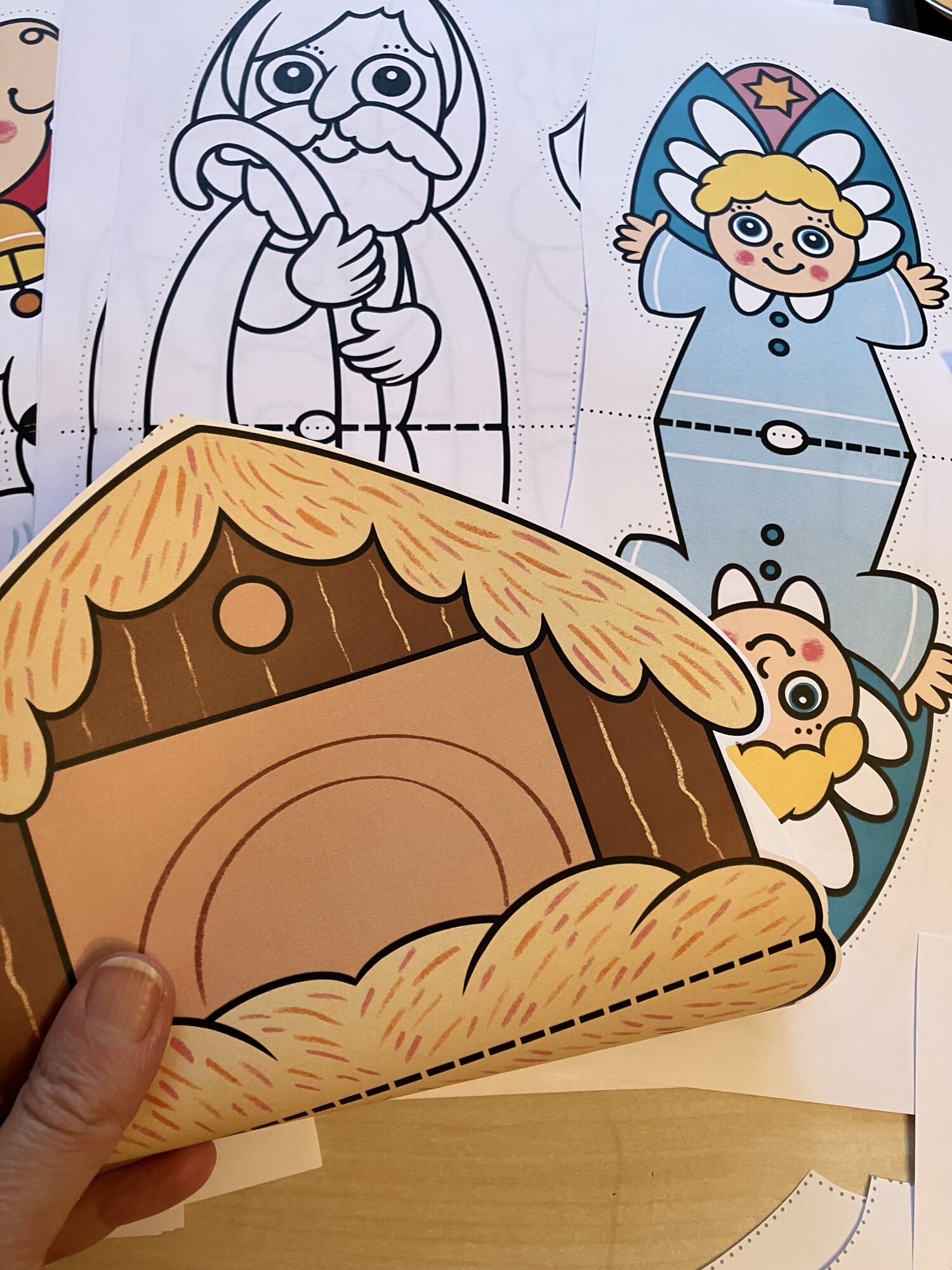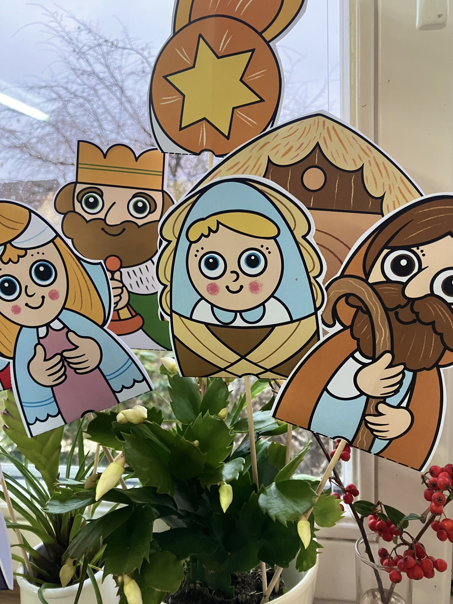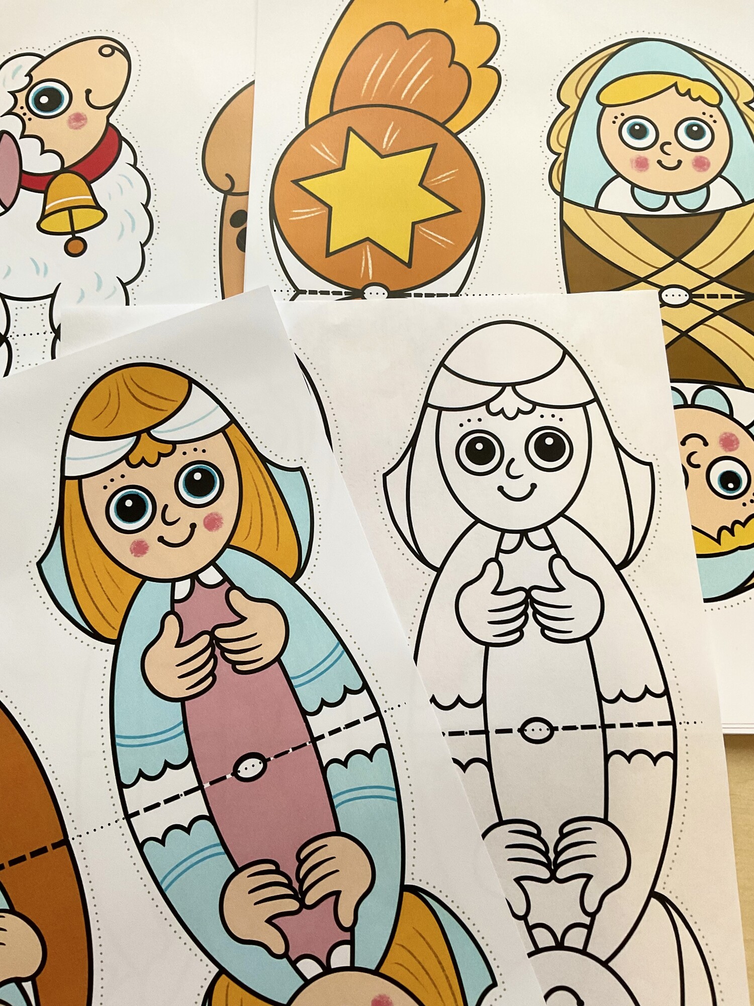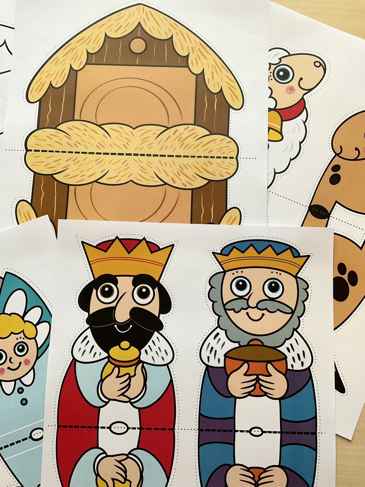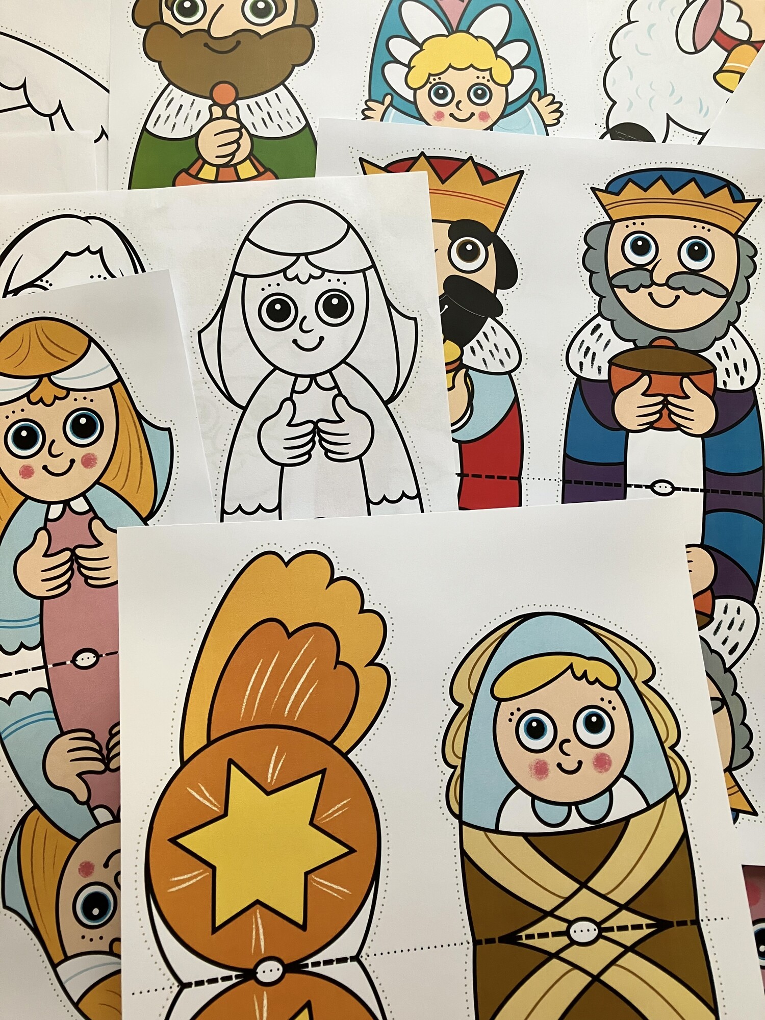 Kolekce obrázků je vhodná pro předškolní děti nebo nejmladší školáky. Děti si lehce vytvoří pěknou dekoraci k adventnímu období v podobě postav z Betléma. Pro práci budou potřebovat jen nůžky, lepidlo a špejle.