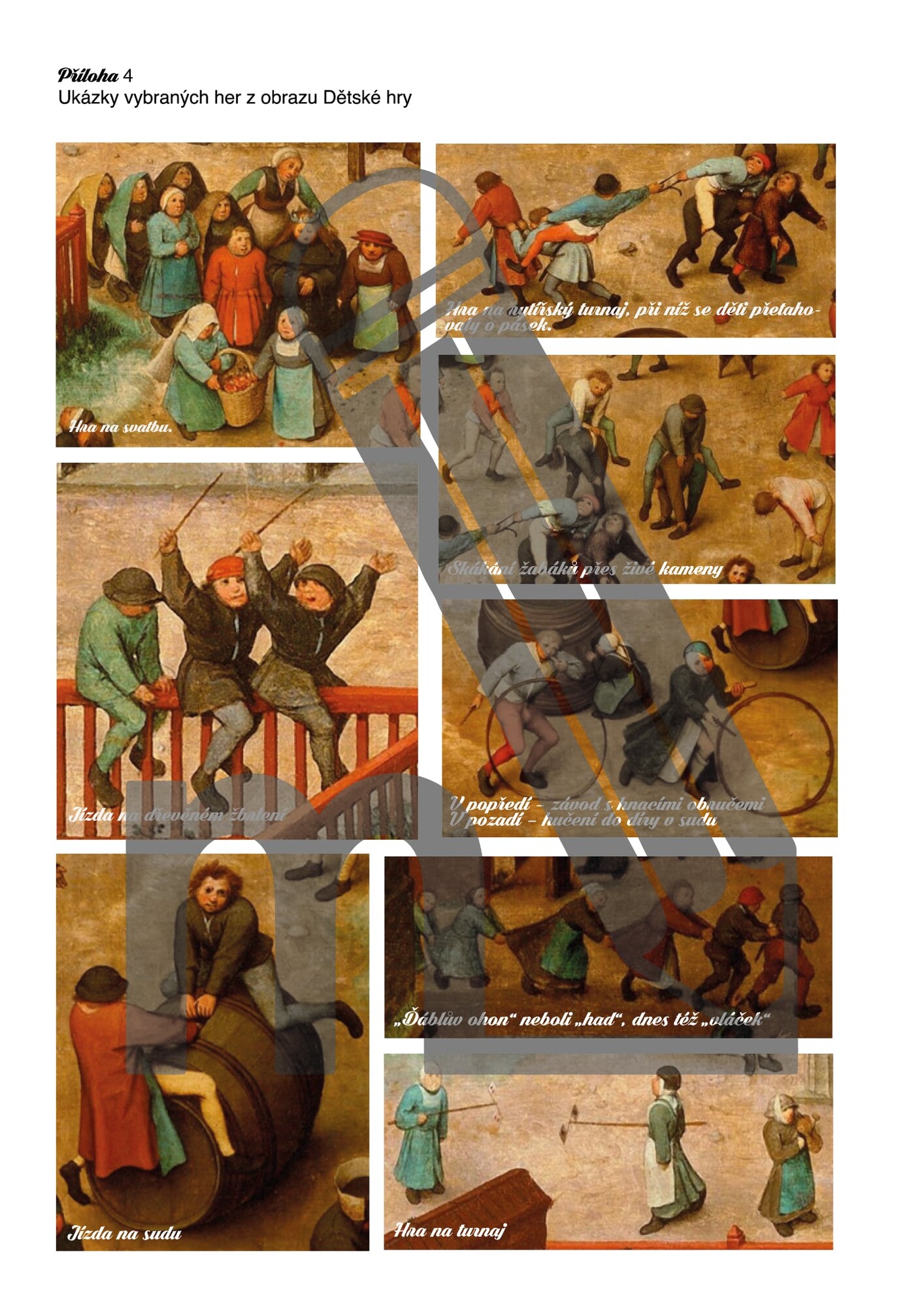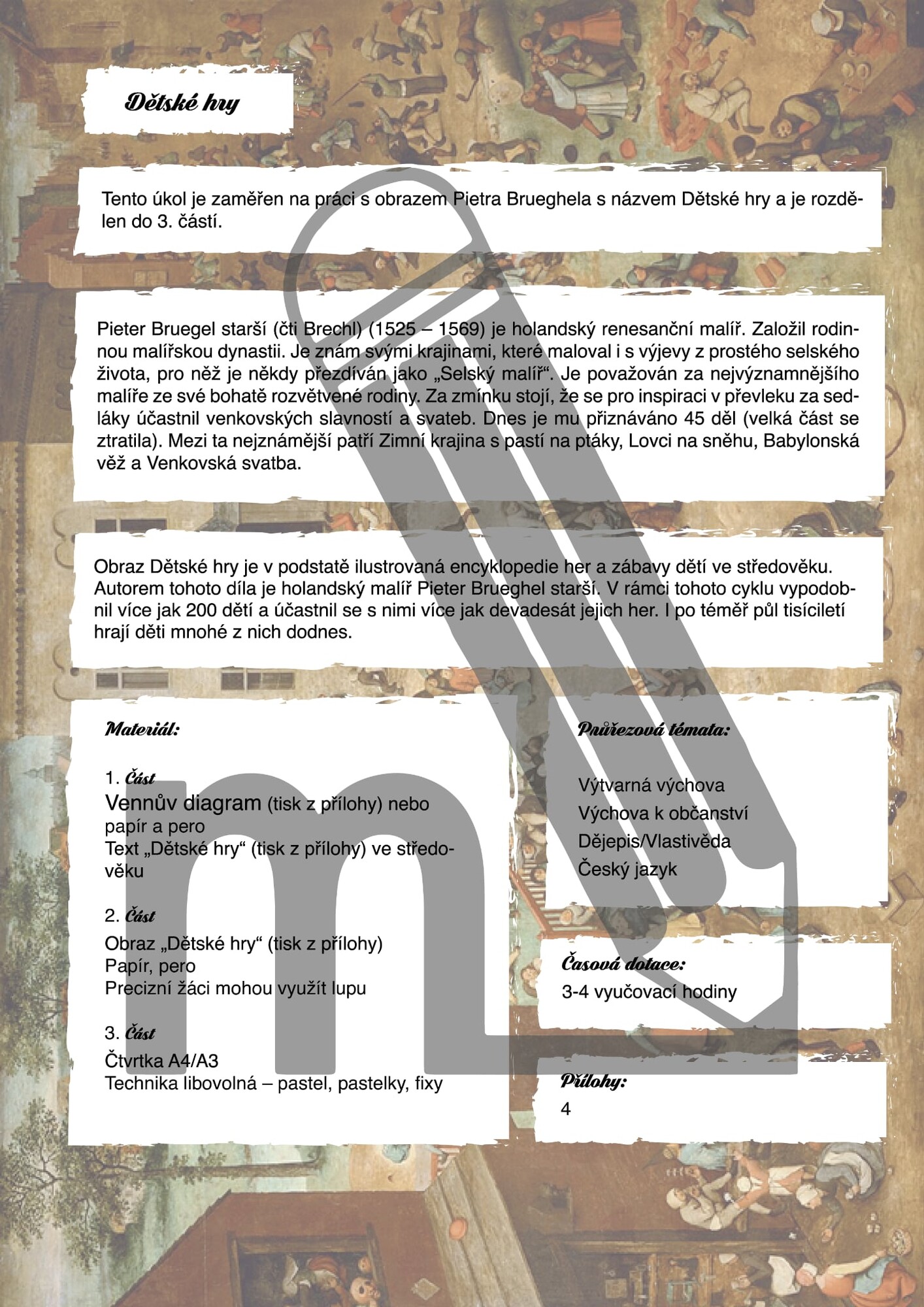 Soubor je inspirován obrazem Pietera Brueghela staršího Dětské hry a nabízí sadu aktivit rozdělenou do tří částí. Žáci se seznámí s výjevy ze středověkého dětství, porovnají hry minulosti se současností, naučí se analyzovat výtvarná díla a vytvoří vlastní práci. Úkoly jsou jasně popsány a doplněny přílohami i doporučeními pro organizaci hodiny či projektového dne.