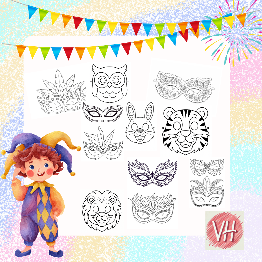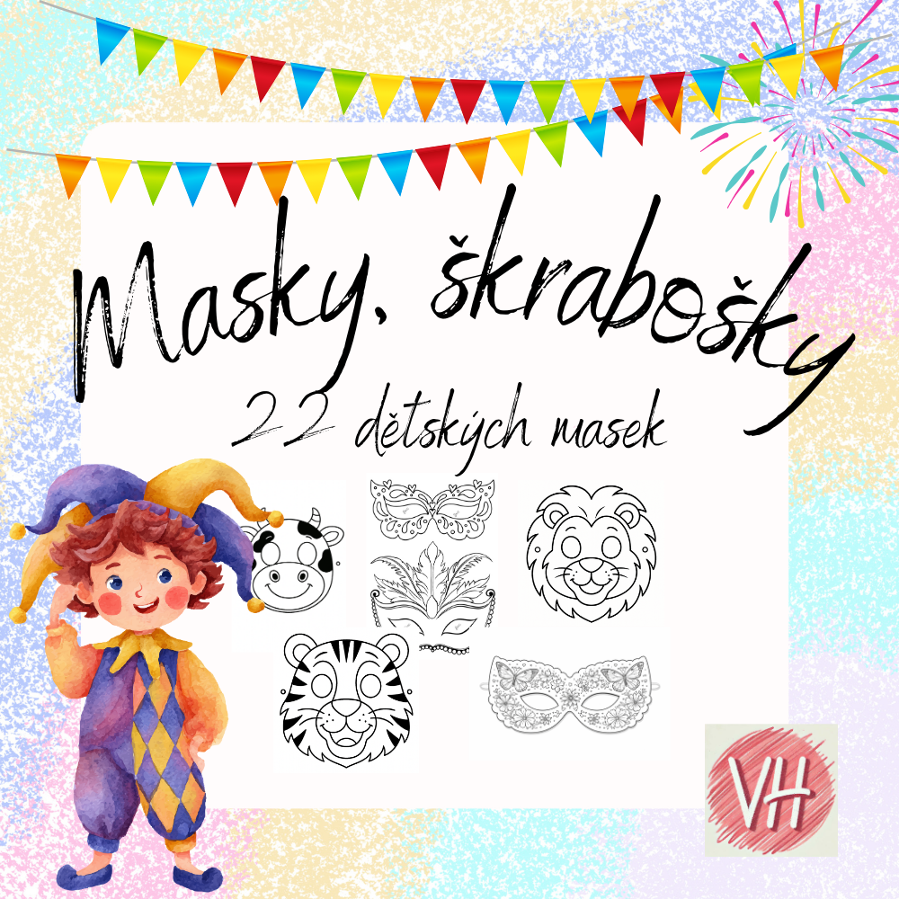 Tyto jednoduché karnevalové masky jsou ideální pro tvoření s dětmi předškolního věku. Stačí masky vytisknout na pevnější papír, děti je mohou vybarvit podle vlastní fantazie a dozdobit například samolepkami, třpytkami nebo peříčky. Po dokončení stačí vystřihnout otvory na oči a připevnit gumičku nebo šňůrku na boky masky. Aktivita podporuje jemnou motoriku, kreativitu a děti si zábavnou formou procvičí i stříhání.