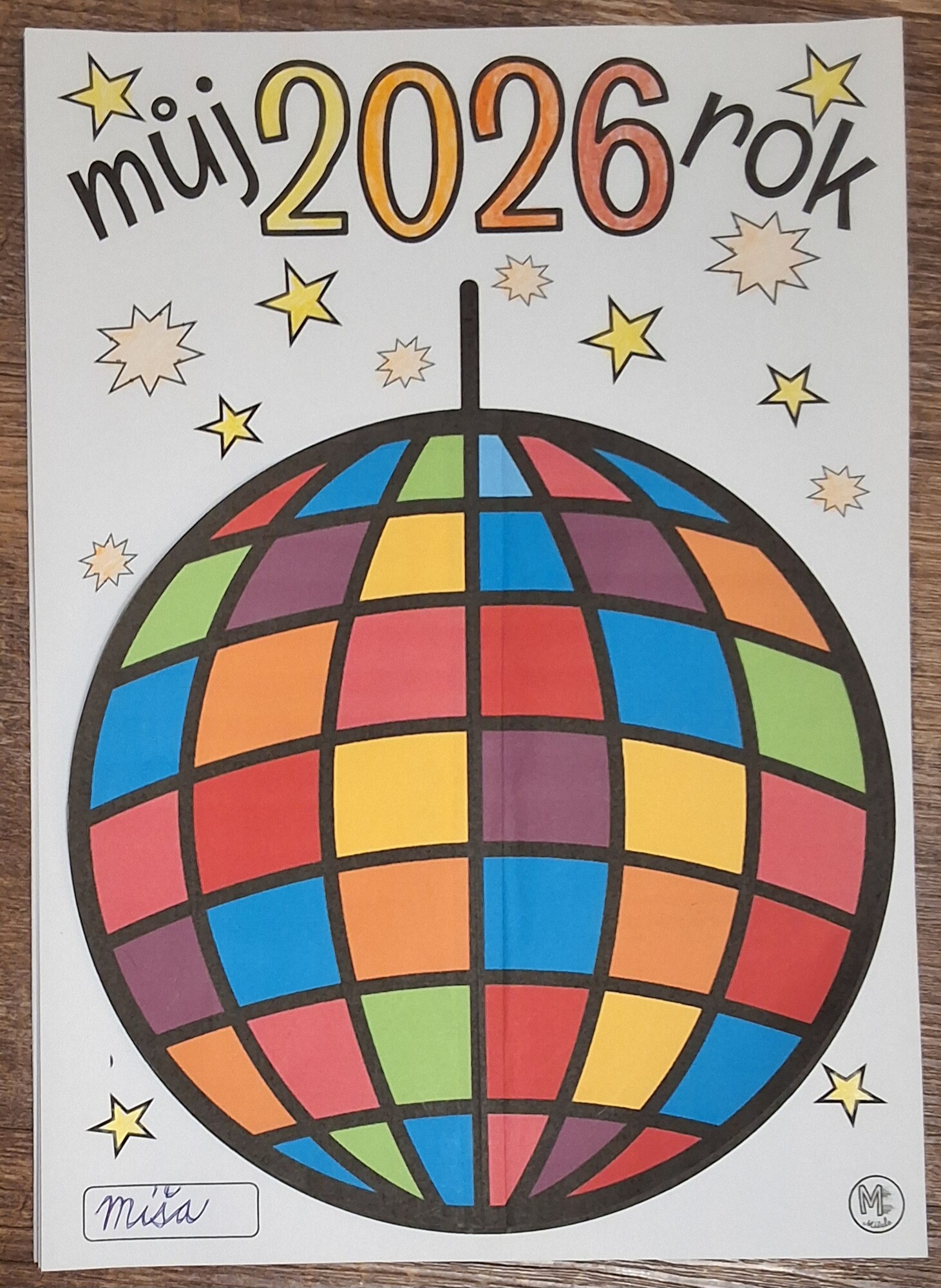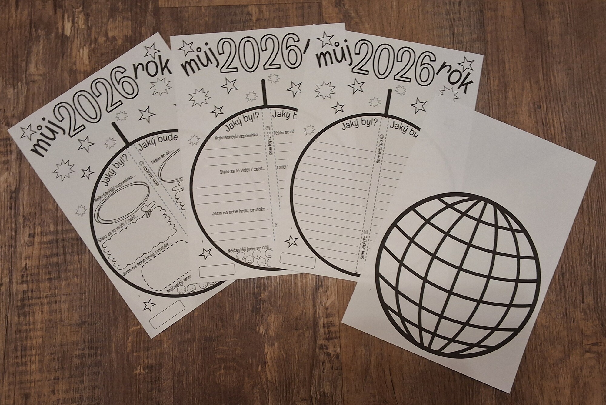 Dále materiál obsahuje samostatný list – diskokouli, kterou si dítě vybarví podle vlastní fantazie, vystřihne a dolepí na pracovní list. Vzniká tak otevírací koule, která umožňuje pracovat se dvěma časovými rovinami – minulým a budoucím rokem. Dítě si samo volí, zda „otevře“ rok minulý, nebo se zaměří na rok budoucí.