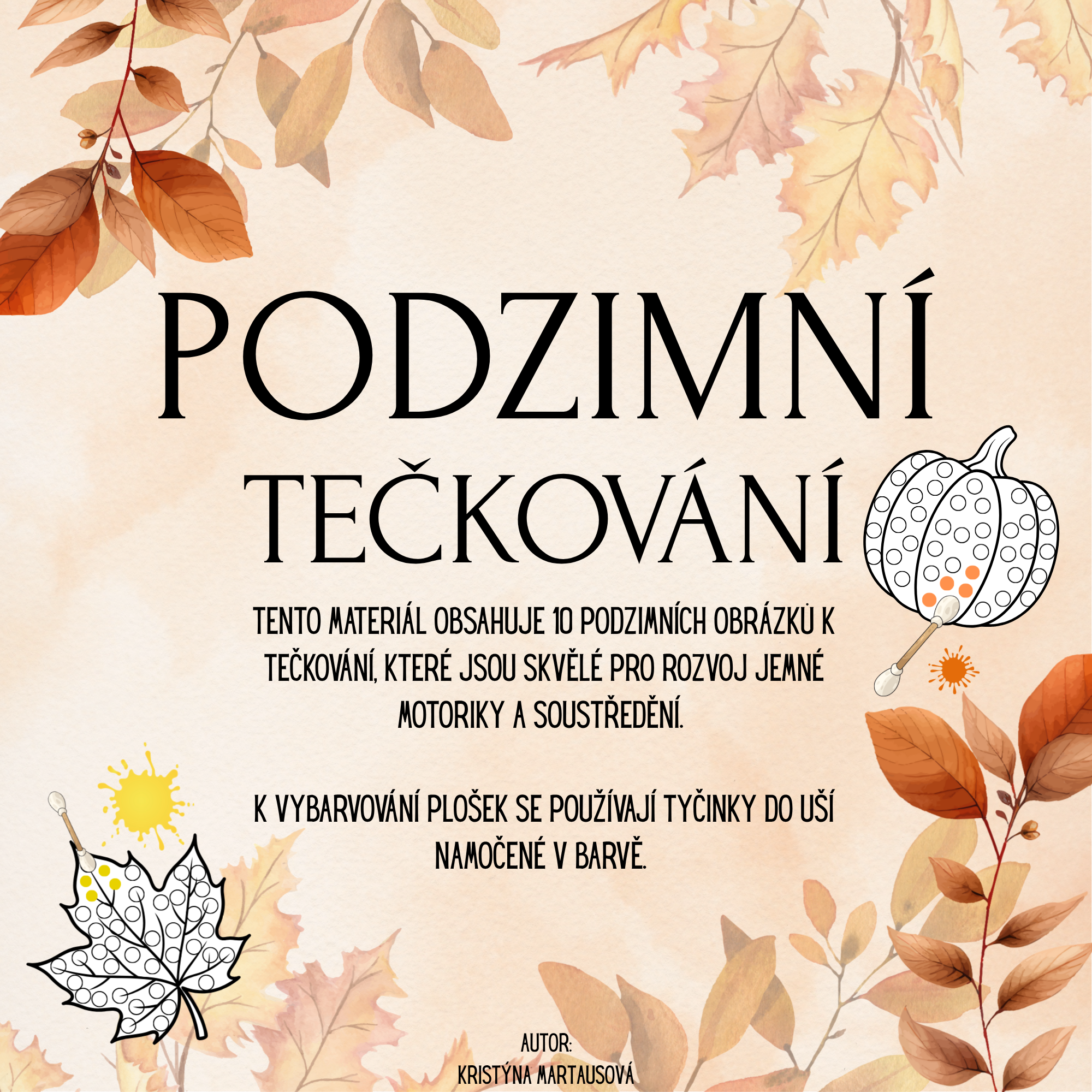 Technika tečkování je velmi jednoduchá, ale efektivní: děti používají tyčinky do uší namočené v temperových barvách k pečlivému vyplnění vyznačených plošek tečkami. Tato aktivita je ideální pro předškoláky a děti na prvním stupni ZŠ, pomáhá s nácvikem správného úchopu, koordinace ruka-oko a posiluje svaly ruky před psaním. Hotové obrázky se navíc stanou krásnou podzimní dekorací!