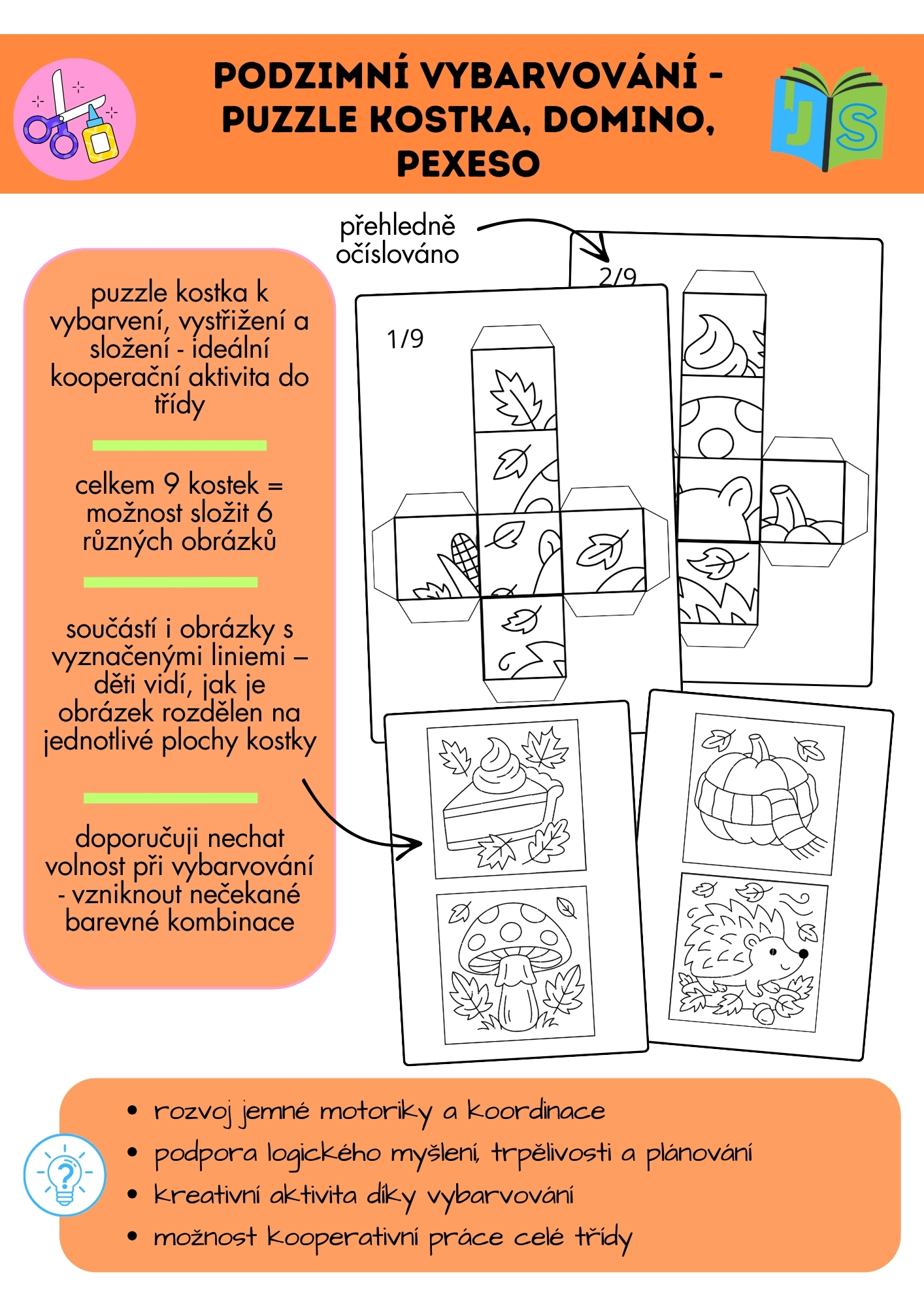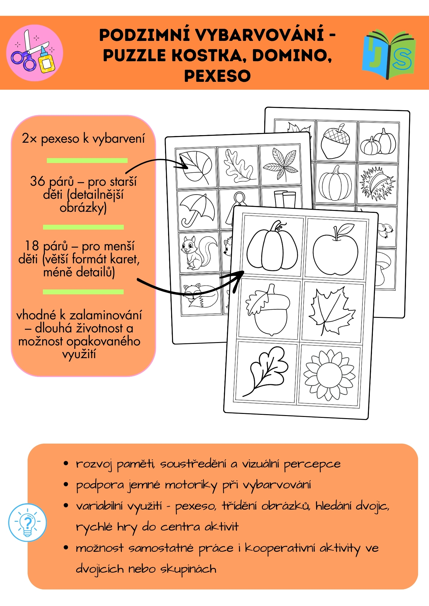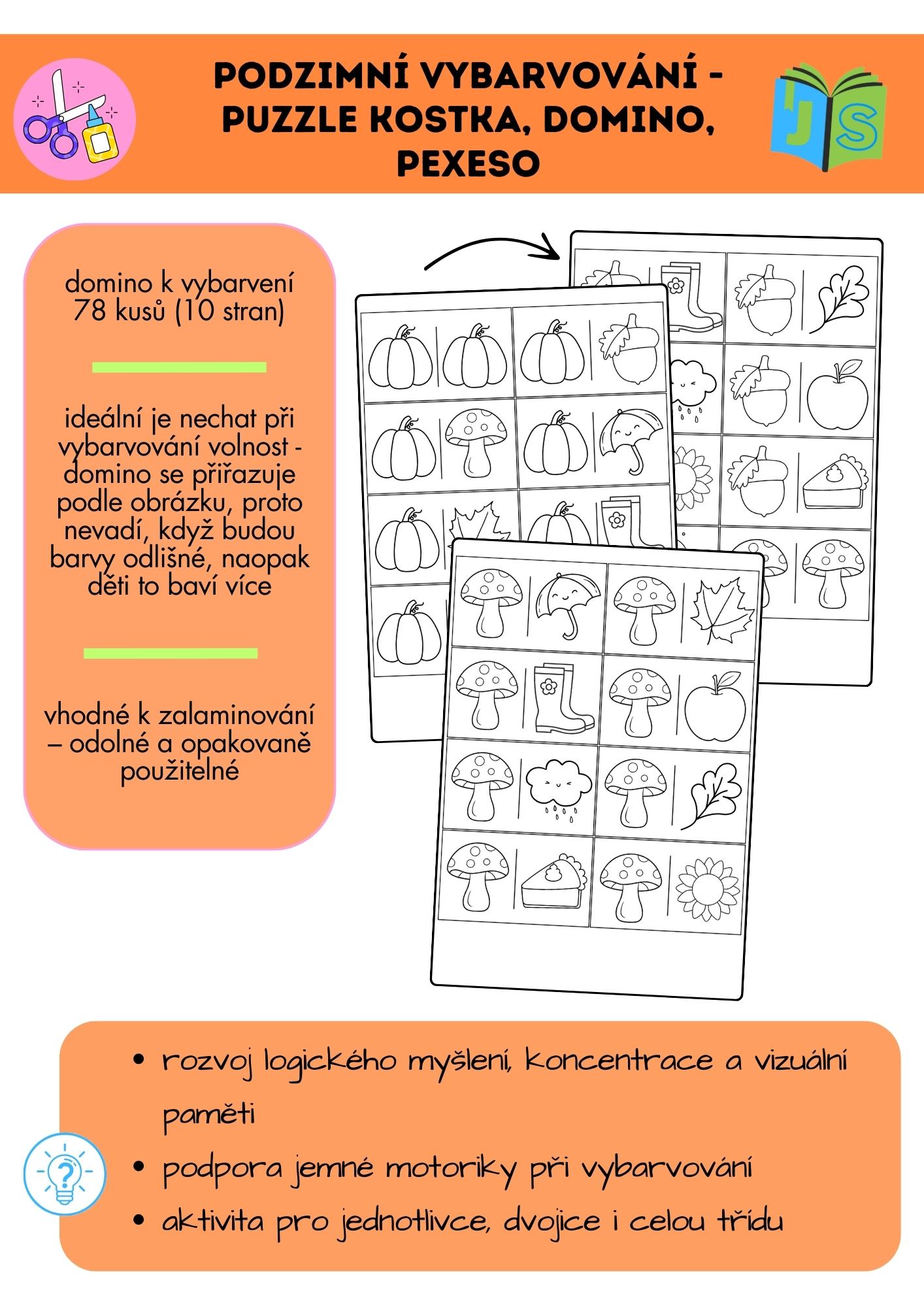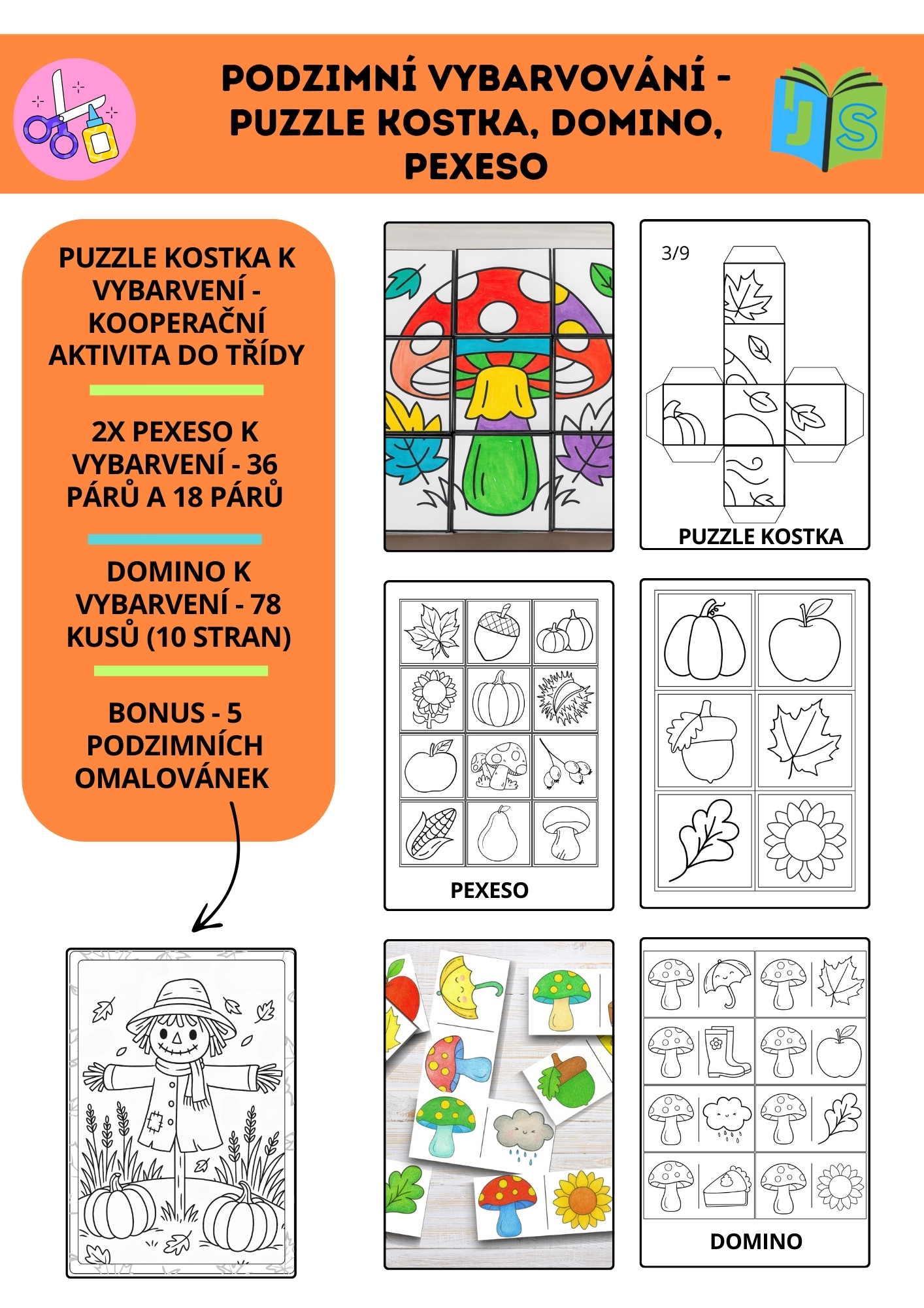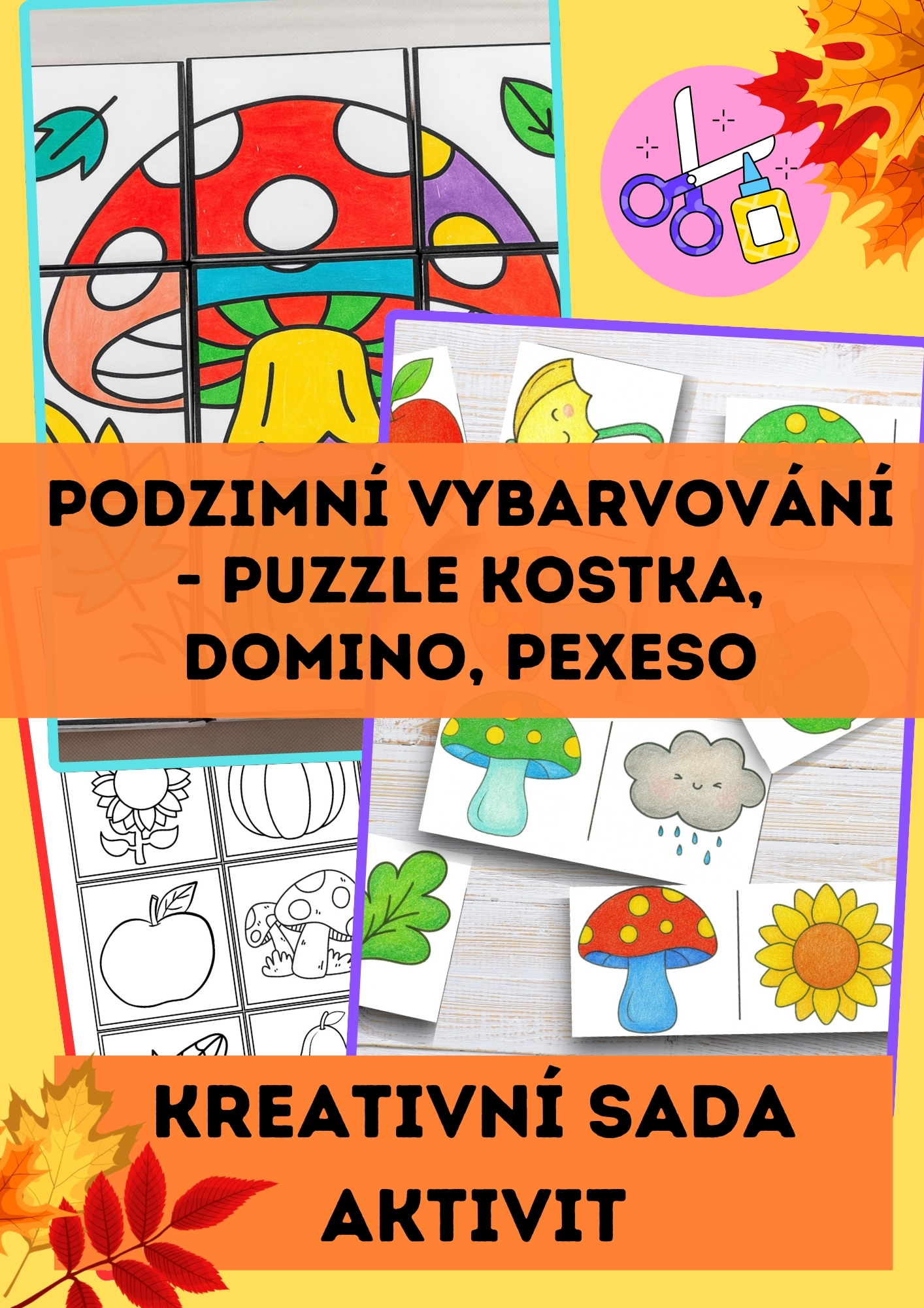 Hledáte aktivitu, která zabaví děti, rozvine jejich dovednosti a zároveň krásně oživí podzimní výuku? Tento velký kreativní balíček nabízí hned tři oblíbené hry k vybarvení – puzzle kostku, pexeso a domino – doplněné o bonusové omalovánky.