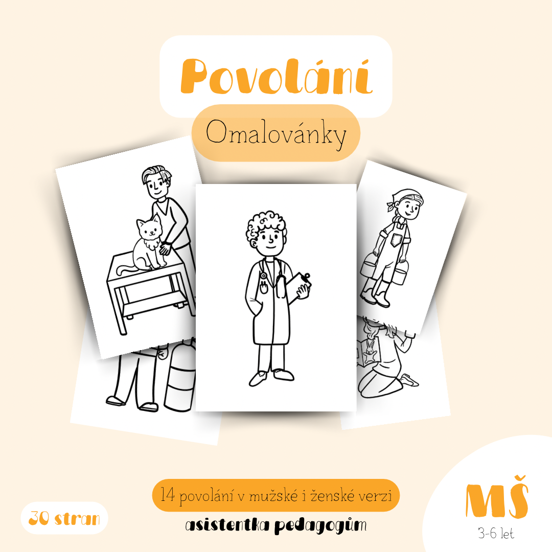 Povolání - omalovánky28 stran omalovánek A4.14 různých povolání v mužské i ženské verzi.Ihned k tisku.