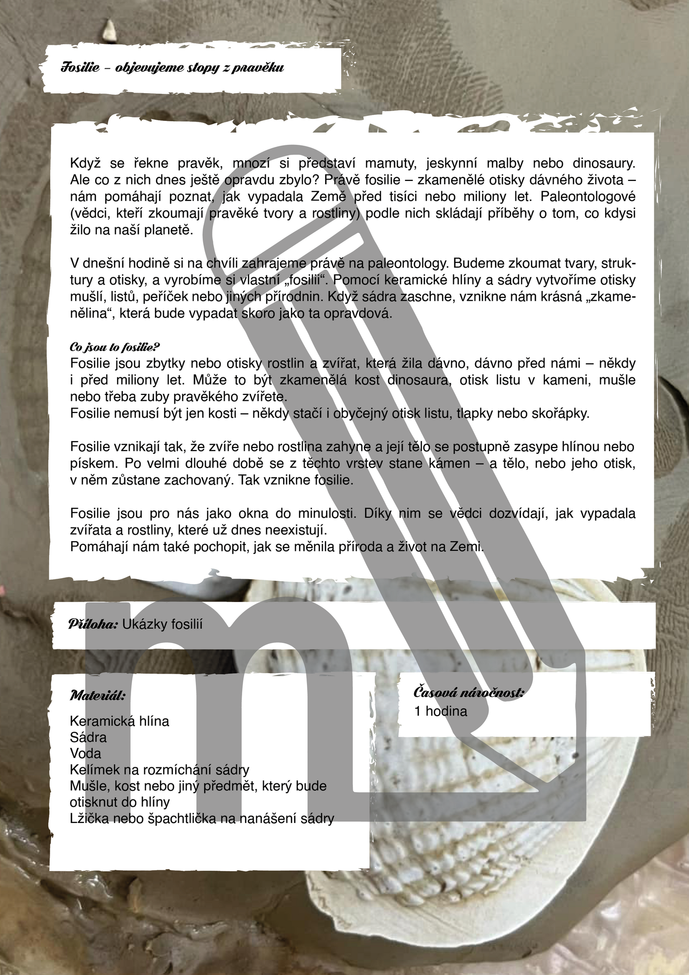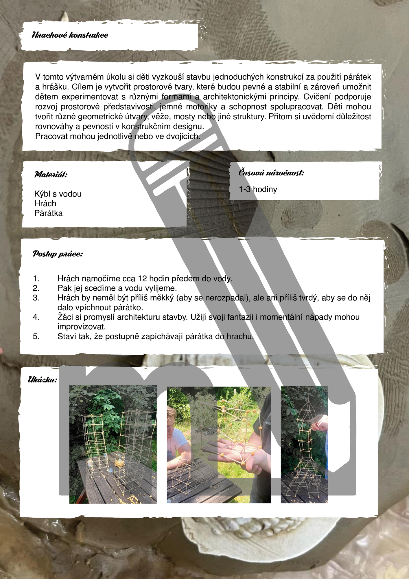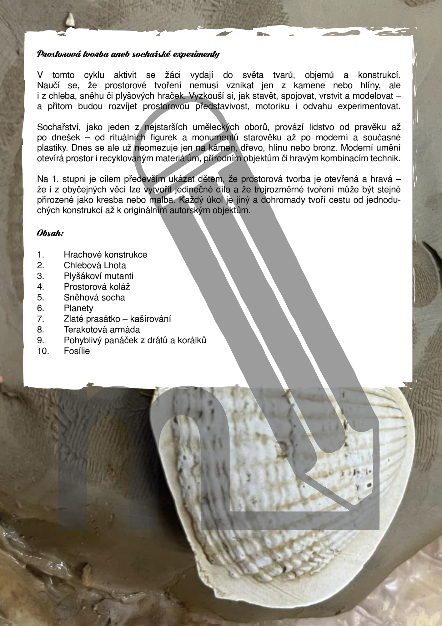 Soubor nabízí deset originálních prostorových a sochařských aktivit pro žáky 1. stupně ZŠ. Děti si vyzkouší stavění konstrukce z hrášku a párátek, vytváření chlebové vesnice, prostorové koláže, modelování vlastní planety, stavění sněhové sochy a další kreativní aktivity a úkoly, které rozvíjejí hravost, týmovou spolupráci, jemnou motoriku i prostorovou představivost. Aktivity vedou děti k objevování nejrůznějších materiálů.