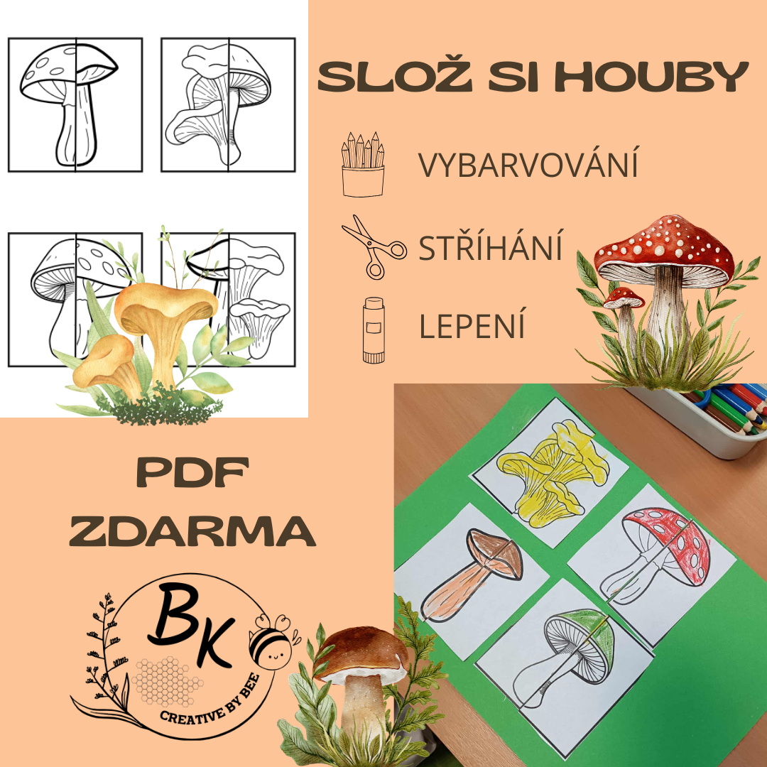 Nejprve si houby vybarví, pak vystřihnou a nakonec hledají správné dvojice poloviček, aby z nich vznikly celé houbičky.