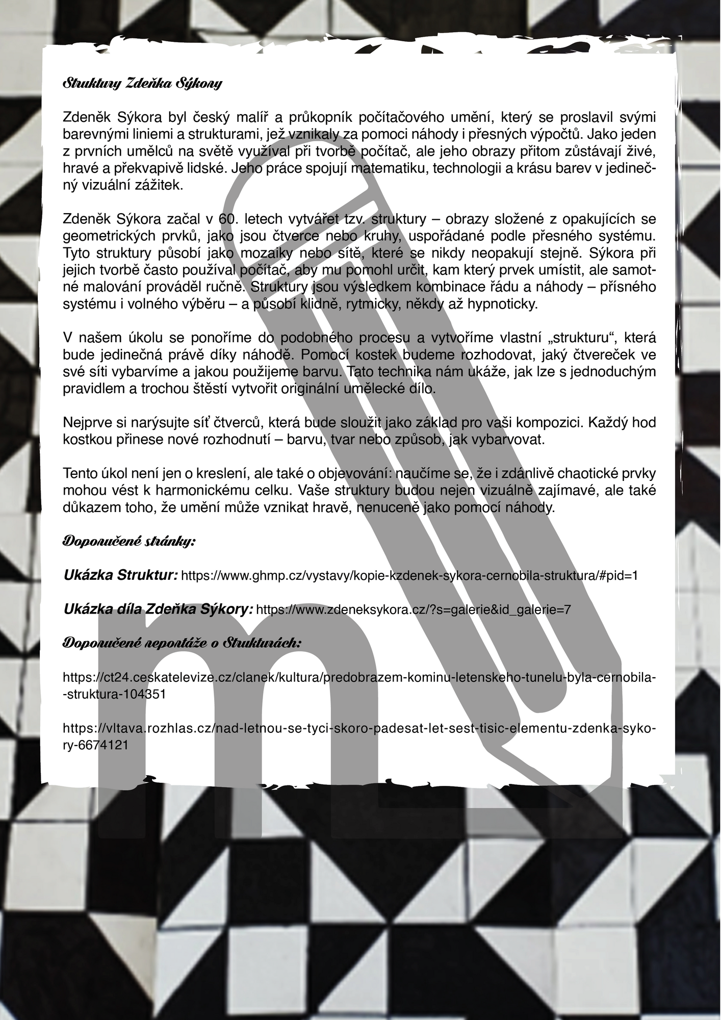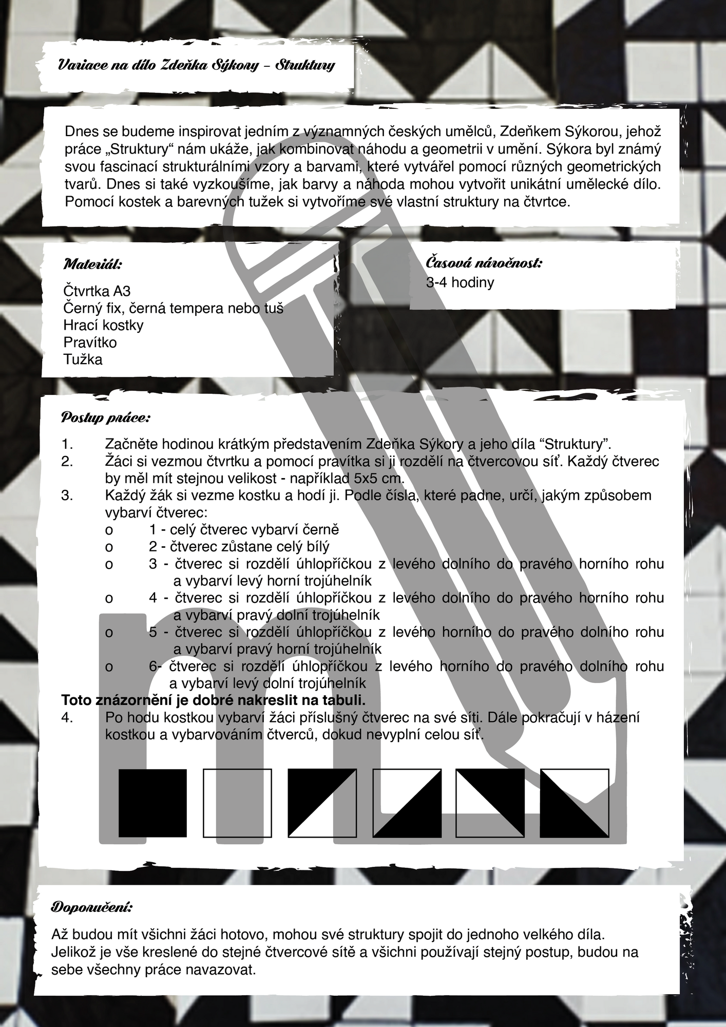Soubor představuje tři výtvarné aktivity pro žáky 1. i 2. stupně ZŠ, které dětem přibližují strukturální obrazy Zdeňka Sýkory. Žáci si vyzkouší černobílou kreslenou strukturu, barevnou strukturu i koláž ze čtverečků různých odstínů, a to vše pomocí náhodného hodu kostkou. Aktivity rozvíjejí práci s geometrií, rytmem, pravidlem i prvkem náhody, který je pro Sýkorovu tvorbu typický.