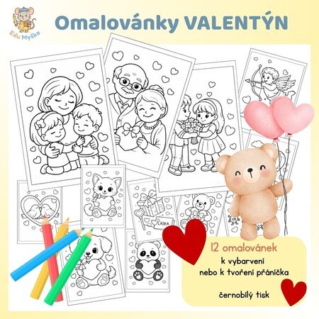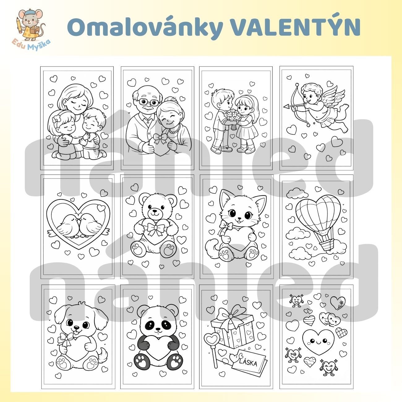 12 omalovánek na téma Valentýn, láska, srdíčka Využití:klasické vybarvováník vytvoření přáníčkak vytvoření girlandy černobílý tisk