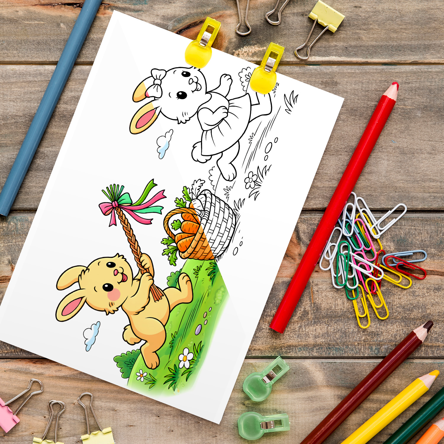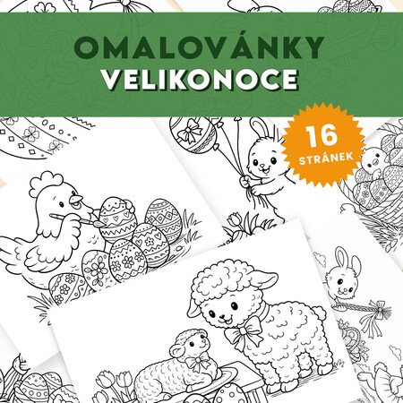 Omalovánky zachycují veselé velikonoční scénky – například zajíčky s pomlázkou, kuřátka, slepičky, beránka, velikonoční kraslice, košík s dobrotami a další milé motivy spojené s Velikonocemi.