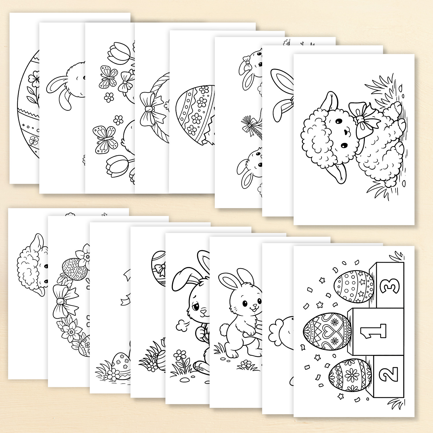 Sada 16 velikonočních omalovánek s roztomilými zvířátky a tradičními velikonočními motivy.