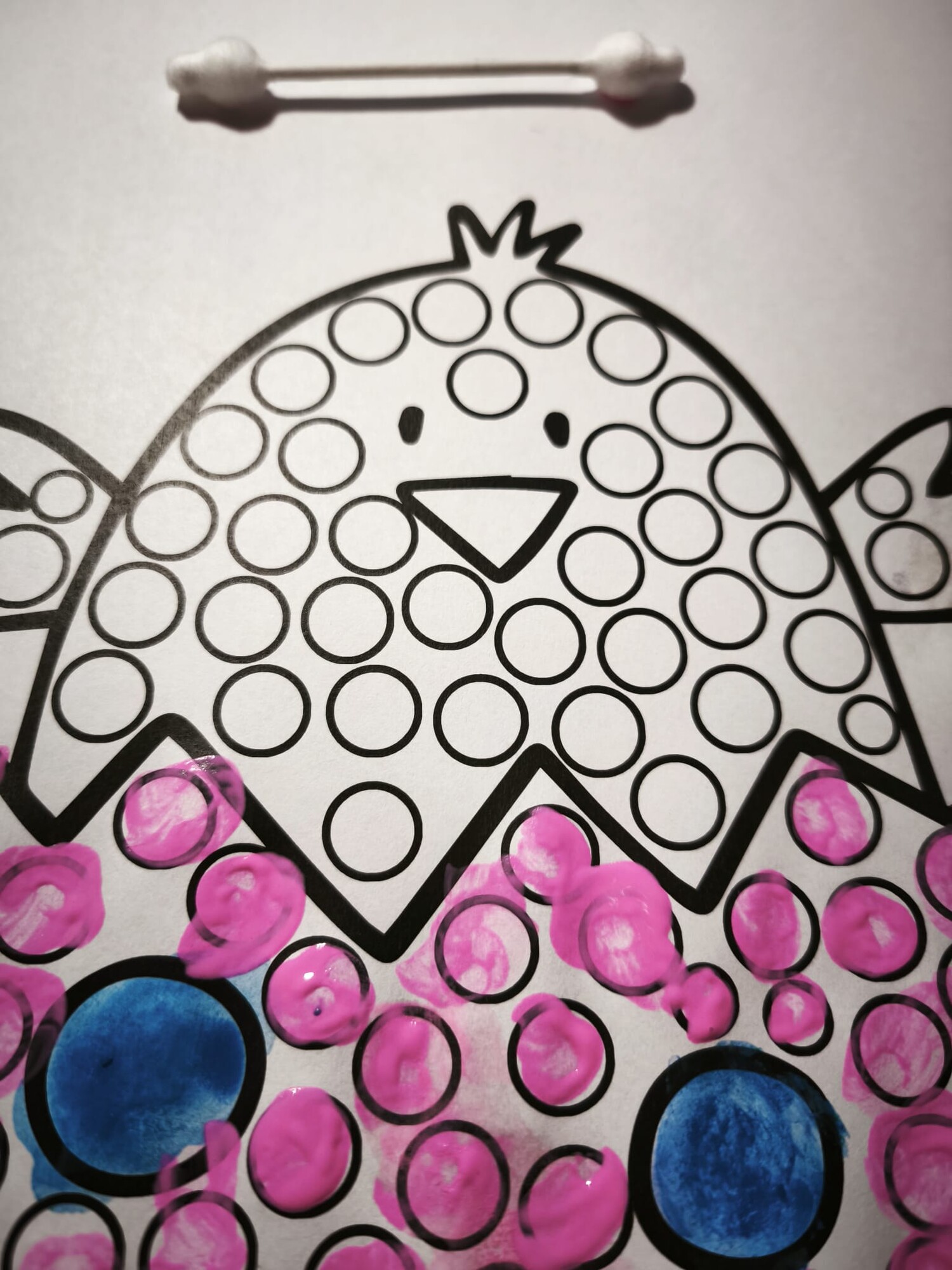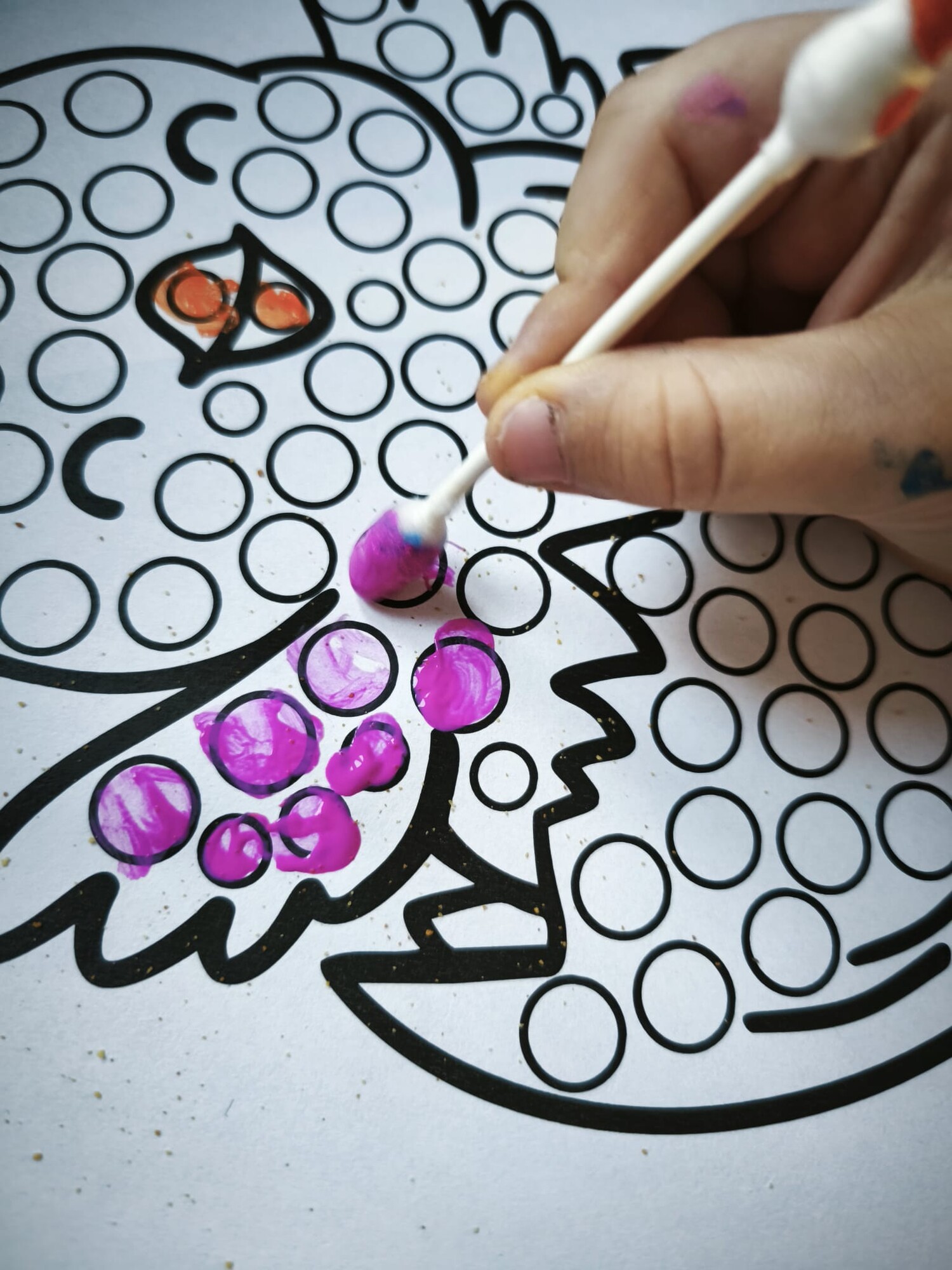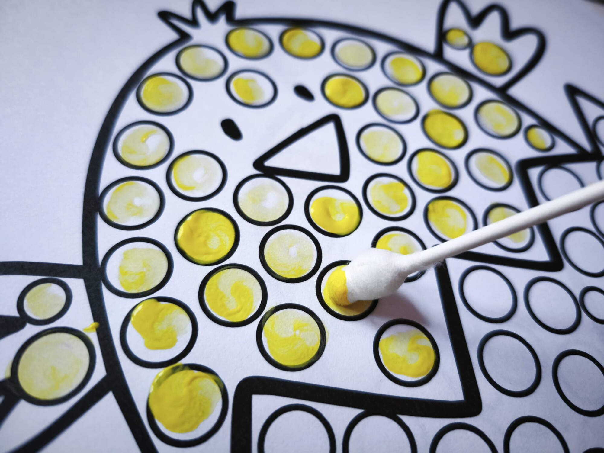 Vatovou tyčinkou a vodovkami/temperami vyťukávejte kroužky na obrázku. Poté si děti mohou obrázky domalovat podle sebe.