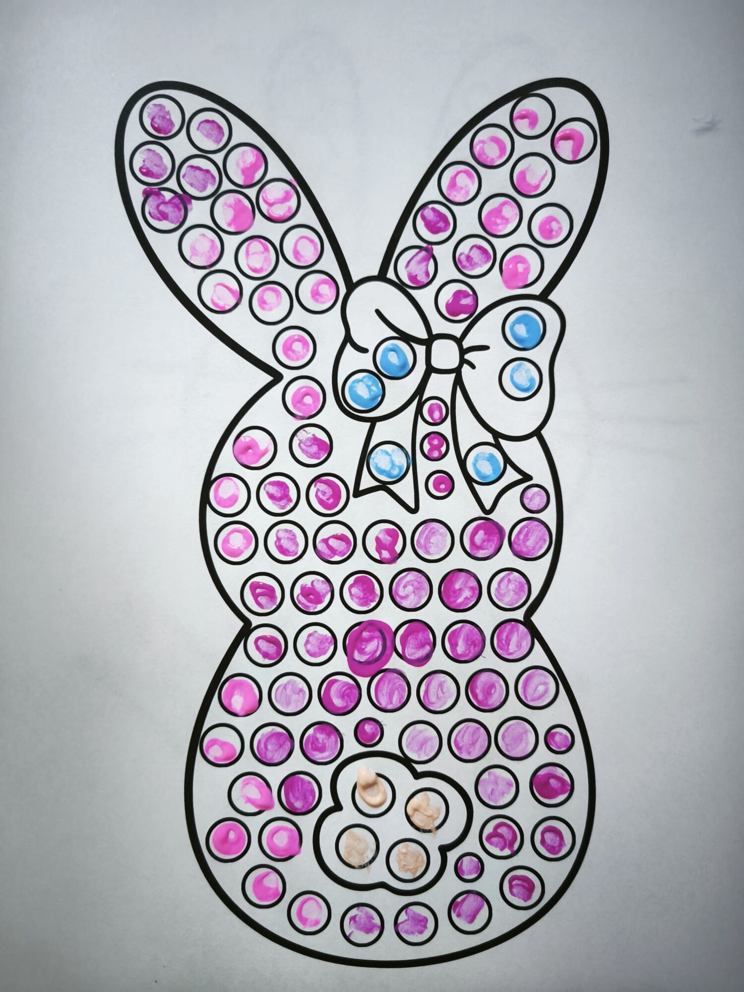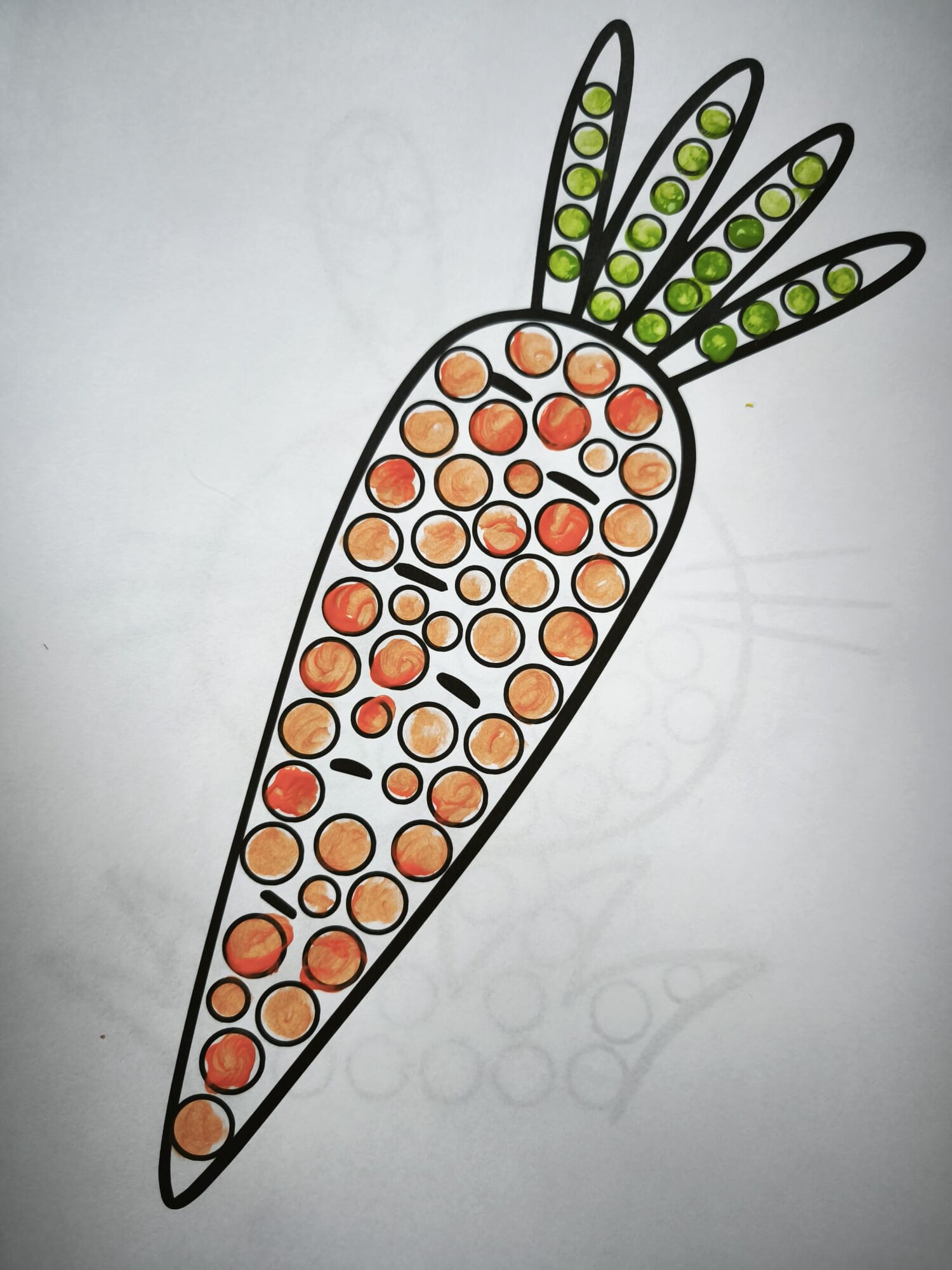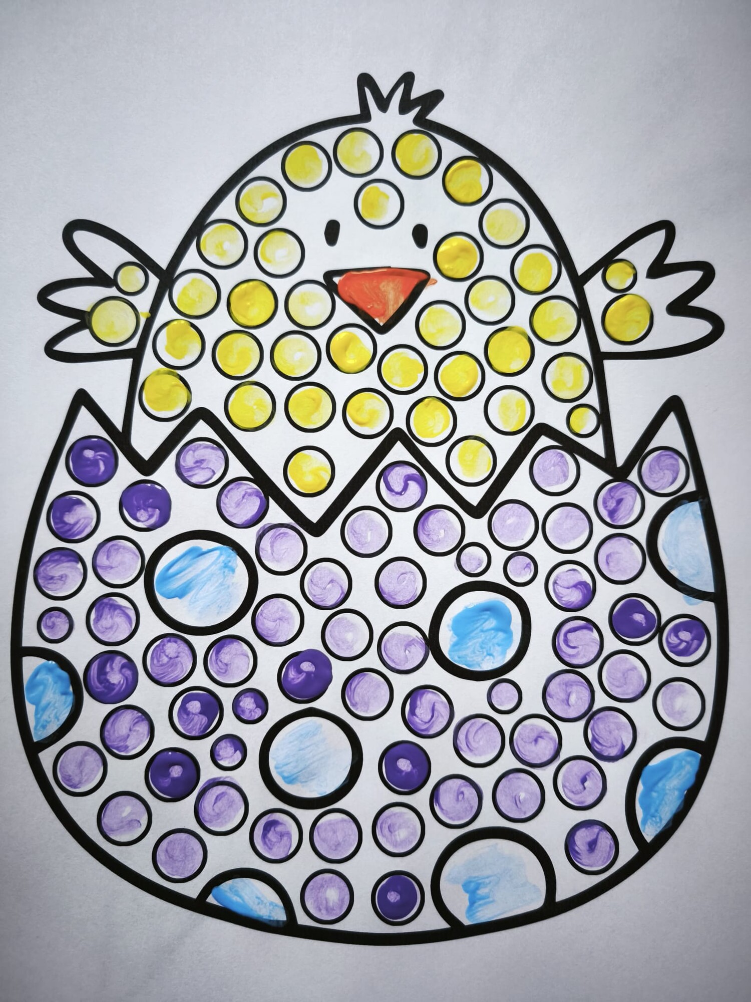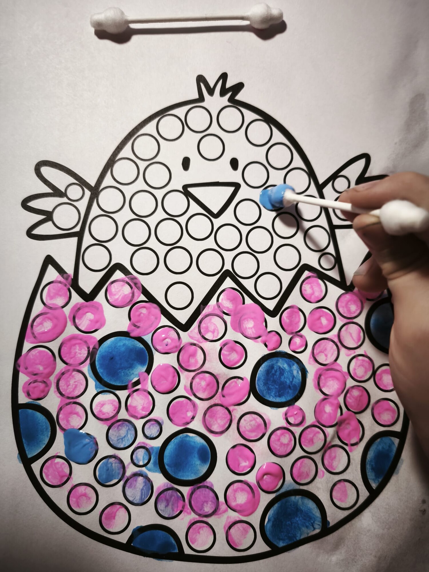 Vatovou tyčinkou a vodovkami/temperami vyťukávejte kroužky na obrázku. Poté si děti mohou obrázky domalovat podle sebe.