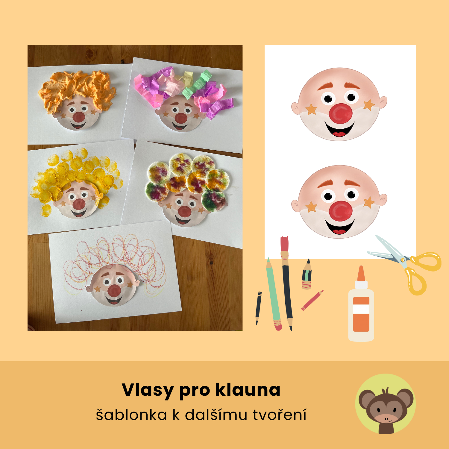 Děti si vystřihnou hlavičku klauna, nalepí ji na tvrdý papír a pak už mohou zapojit fantazii a vytvořit mu ty nejbláznivější a nejbarevnější vlasy.