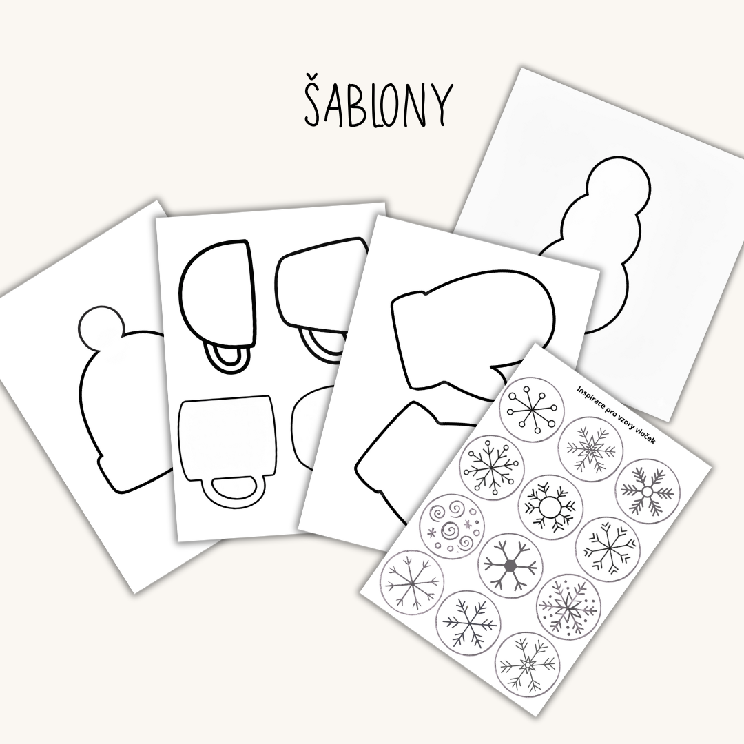 šablony (rukavice, čepice, hrnečky, sněhulák, vzory)