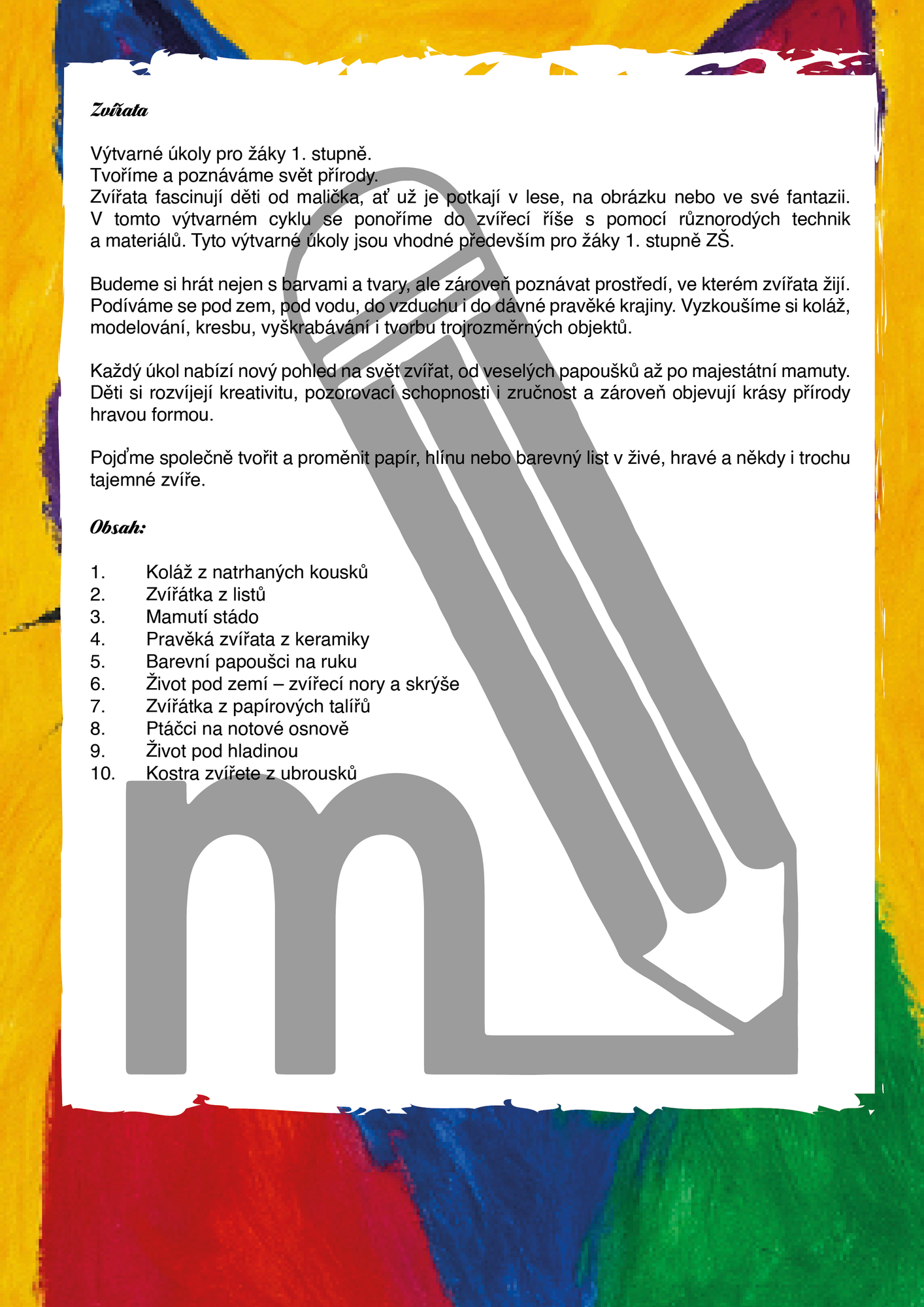 Soubor přináší deset výtvarných aktivit pro žáky 1. i 2. stupně ZŠ, které se zaměřují na zvířata, přírodu a různé prostředí, ve kterých živočichové žijí. Děti si vyzkouší koláž z natrhaných kousků papíru, tvorbu mamuta s huňatou srstí nebo papouška na ruku vyrobeného z kartonu. Nechybí další projekty, které podporují fantazii, kreativitu a radost z objevování světa zvířat.