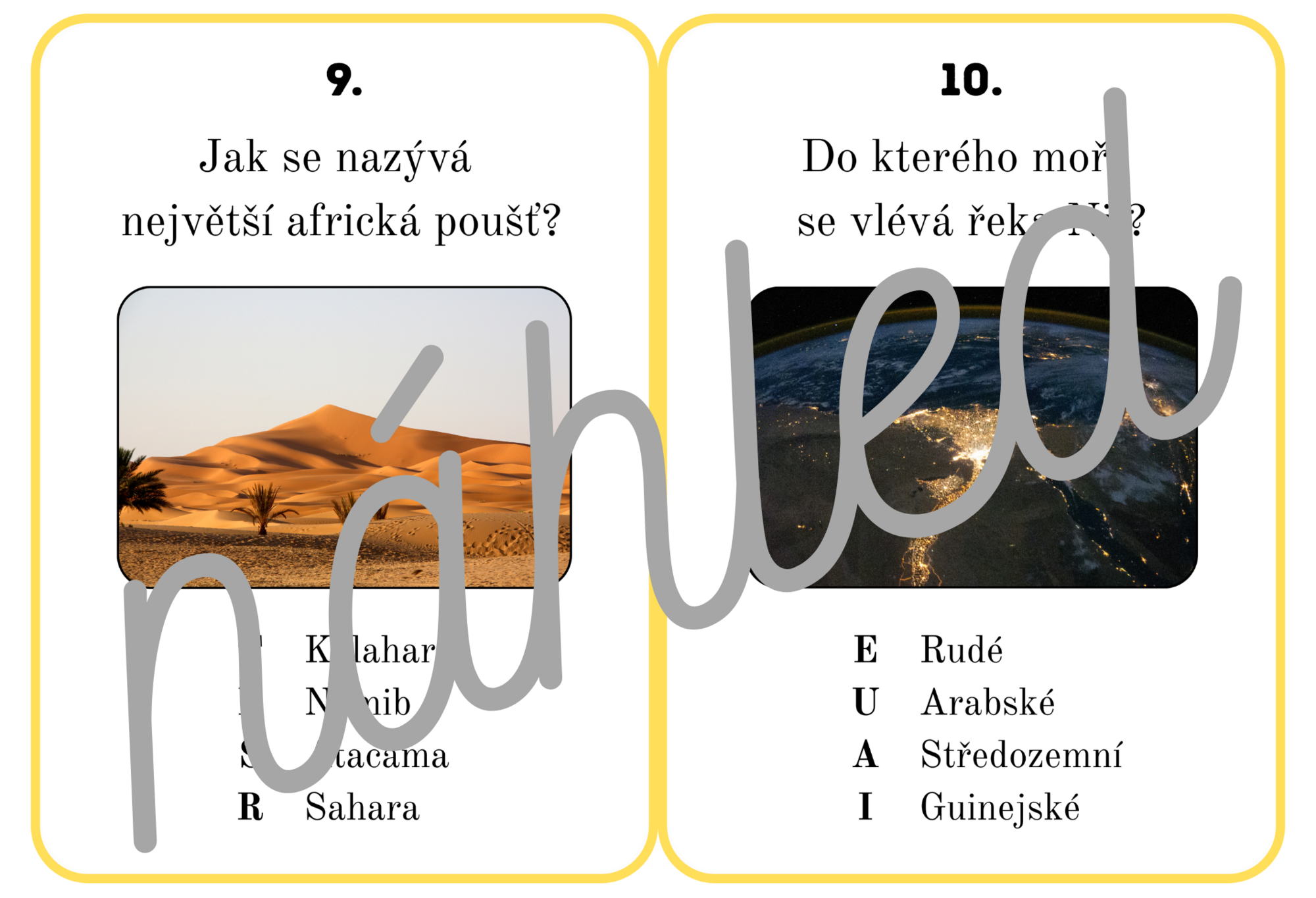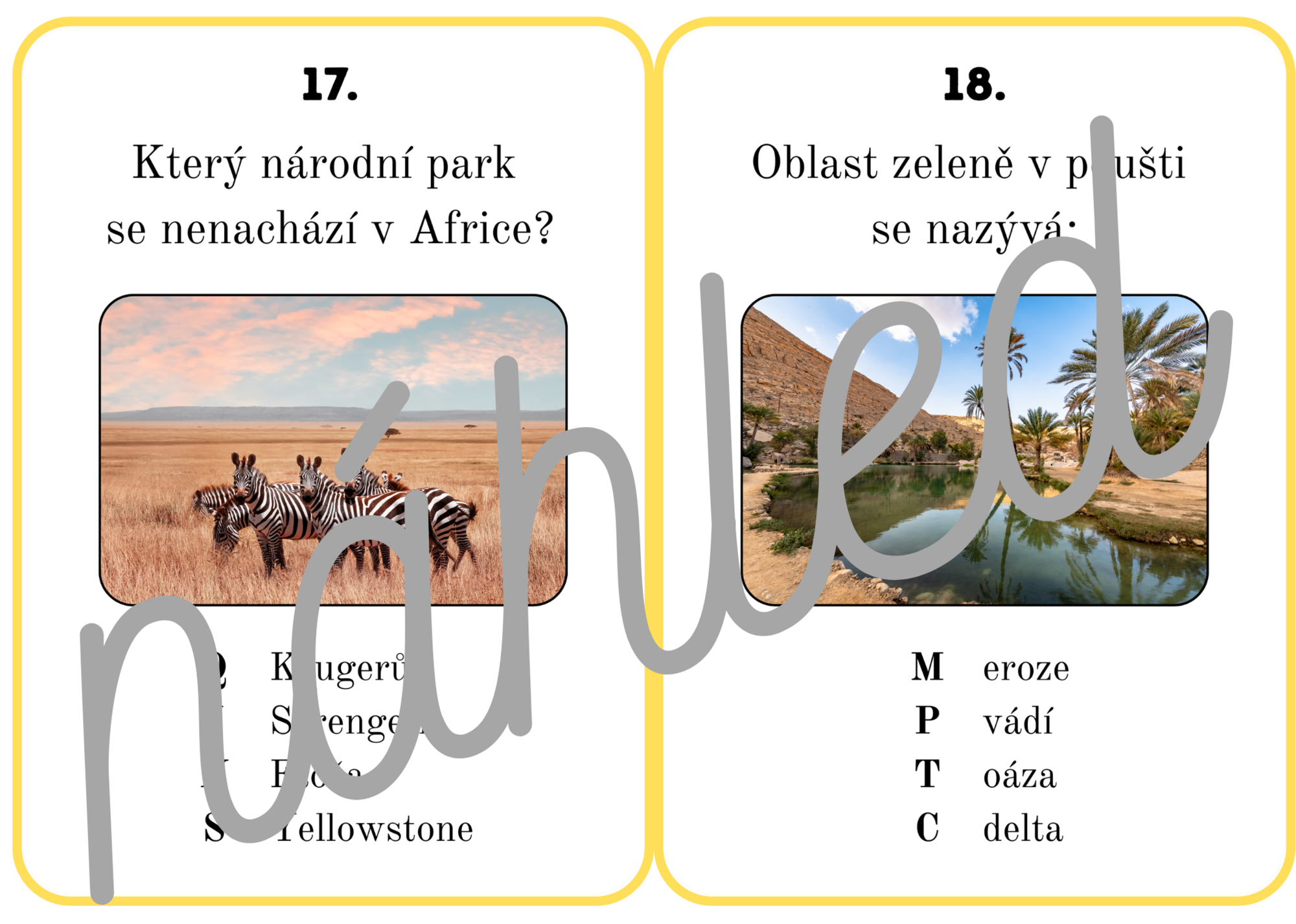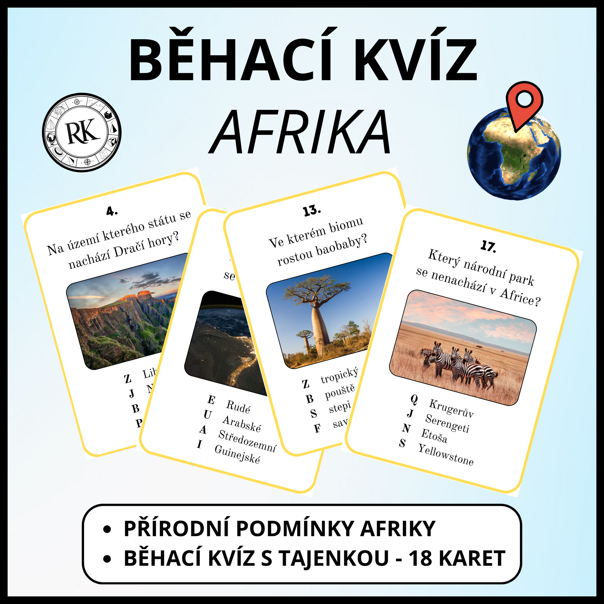 Vzdělávací materiál obsahuje 18 karet k opakování znalostí o přírodních podmínkách Afriky a kartu pro zápis tajenky. Doporučuji opakovací karty vytisknout, zalaminovat a rozstříhat.