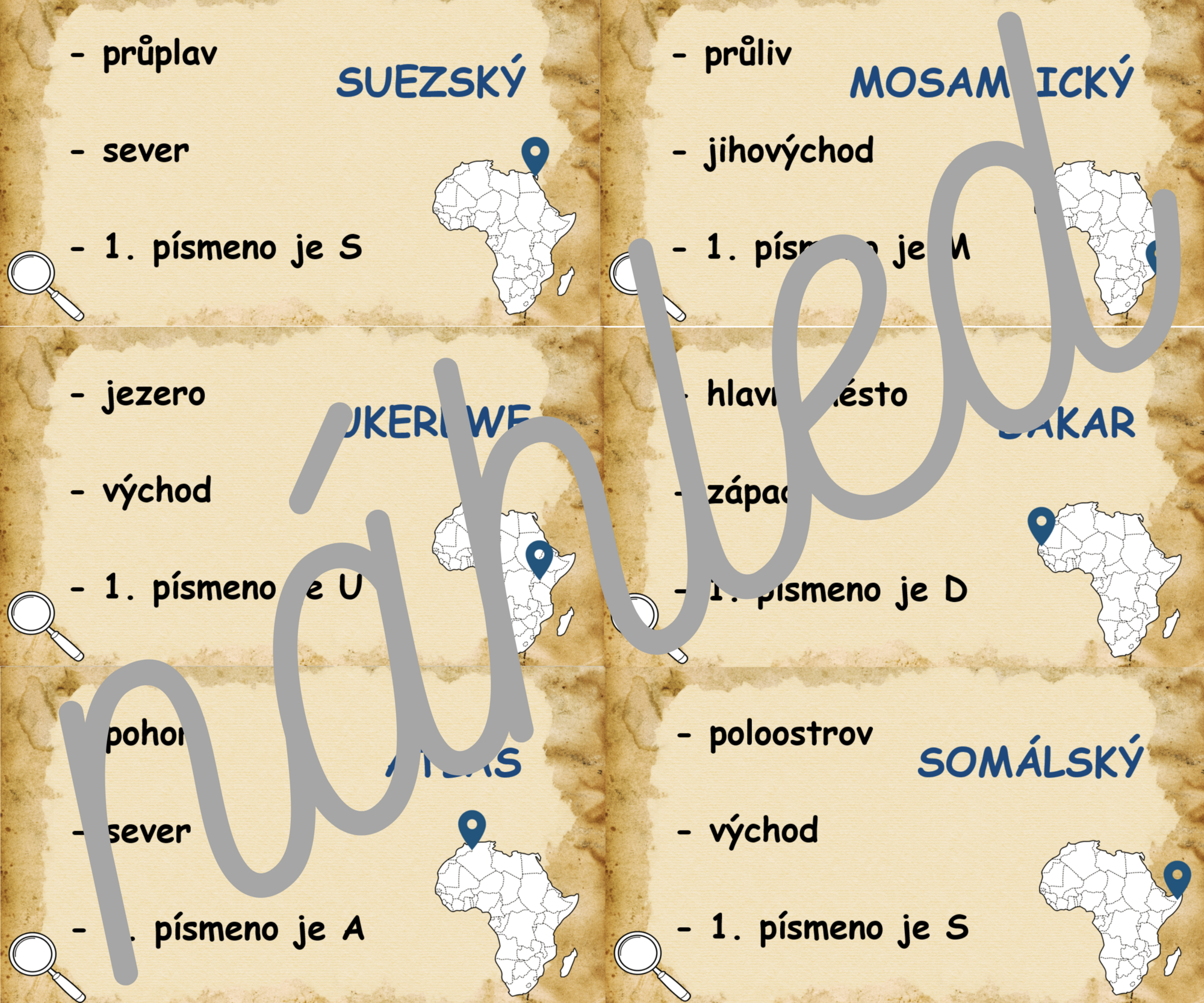 Aktivita slouží k rychlé, interaktivní rozcvičce - ideálně na úvod k probíraného světadílu (Afrika) nebo kdykoliv ke zpestření začátku/konce vyučovací hodiny. Osobně používám materiál také na začátku 6. třídy při seznámení s mapou a atlasem.