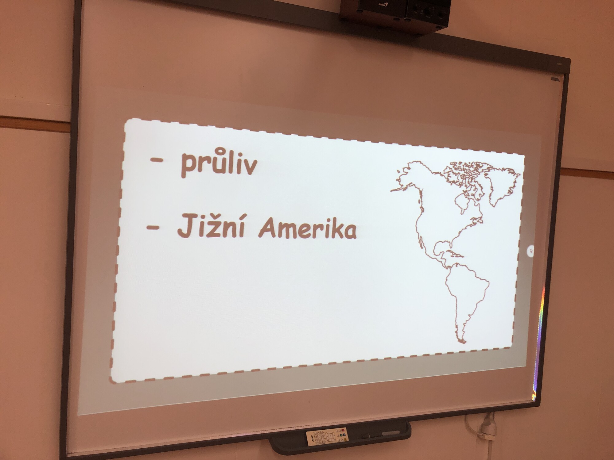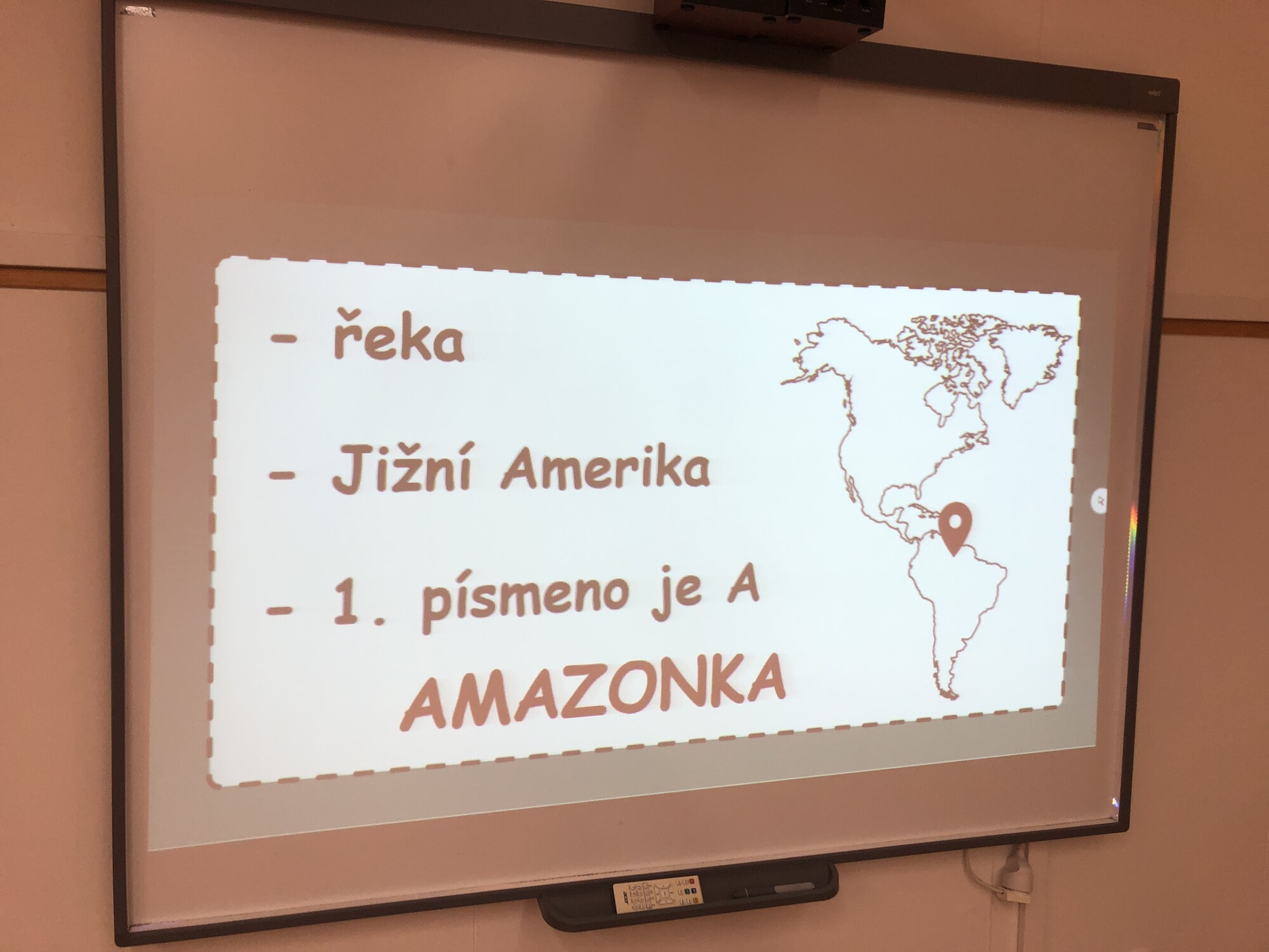 Vyučující spustí prezentaci na interaktivní tabuli a u každého hledaného pojmu zobrazí 3 indicie (ideálně s odstupem cca 5 vteřin, aby měli žáci čas zorientovat se v mapě). 1. indicie je název hledaného objektu (pohoří, řeka, stát, jezero, poušť, ostrov, …), 2. indicie je část Ameriky, ve které se pojem nachází (Severní, Střední, Jižní), 3. indicie tvoří první písmeno z názvu.