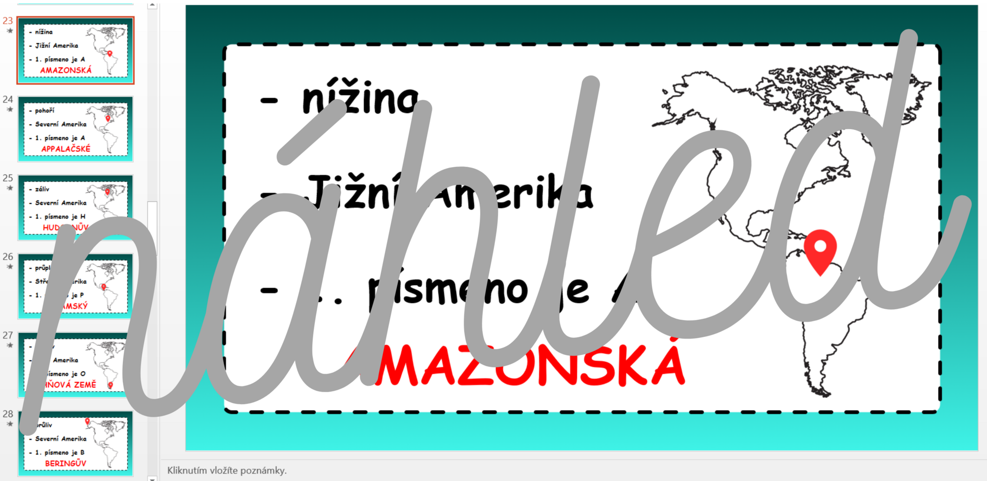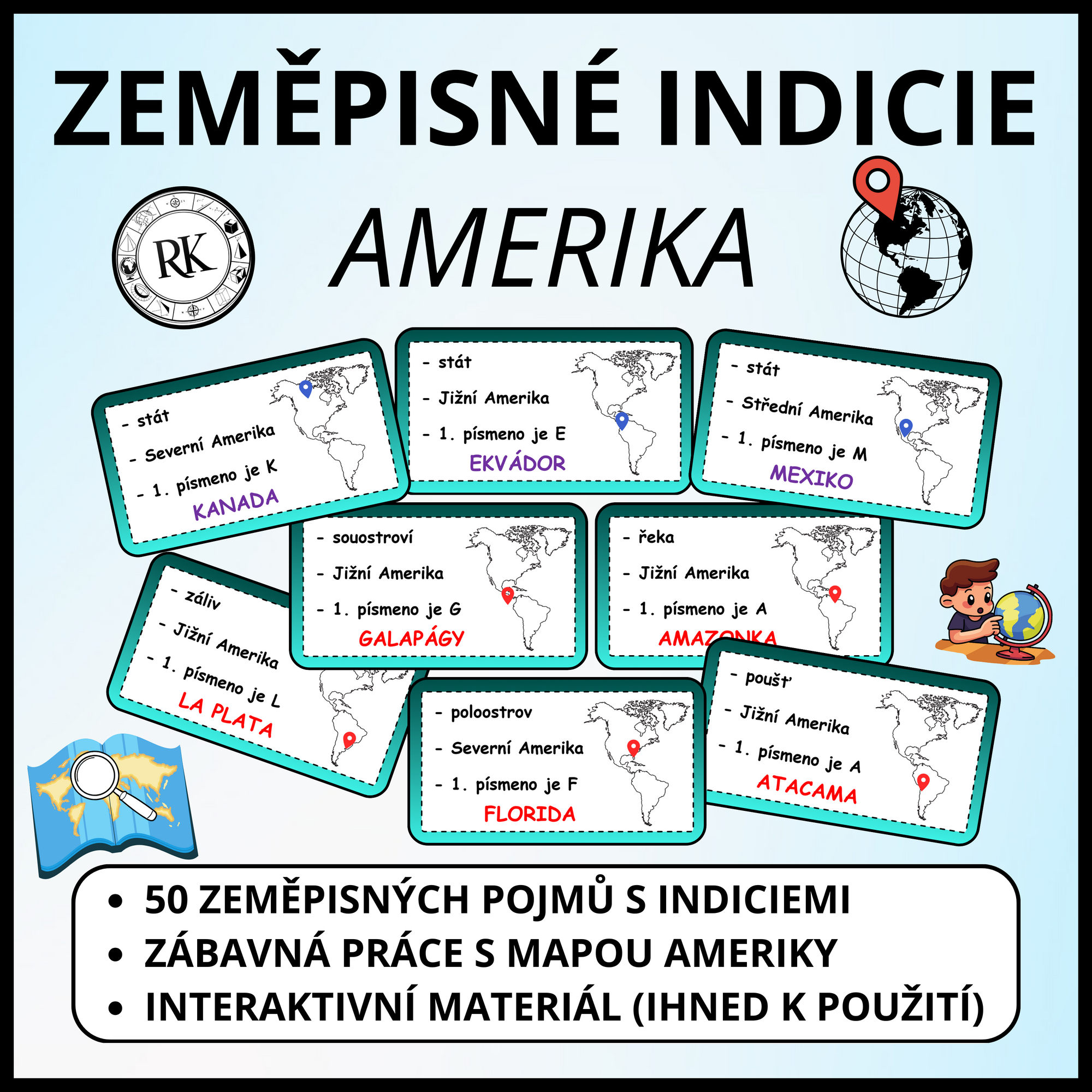 Vzdělávací materiál tvoří interaktivní prezentace vhodná k procvičování práce s atlasem a seznámení se základními geografickými pojmy na mapě Ameriky formou indicií. Prezentace obsahuje celkem 50 geografických objektů (30 pojmů přírodních podmínek a 20 států). Materiál je možné použít ihned bez předešlé přípravy a není potřeba nic tisknout.