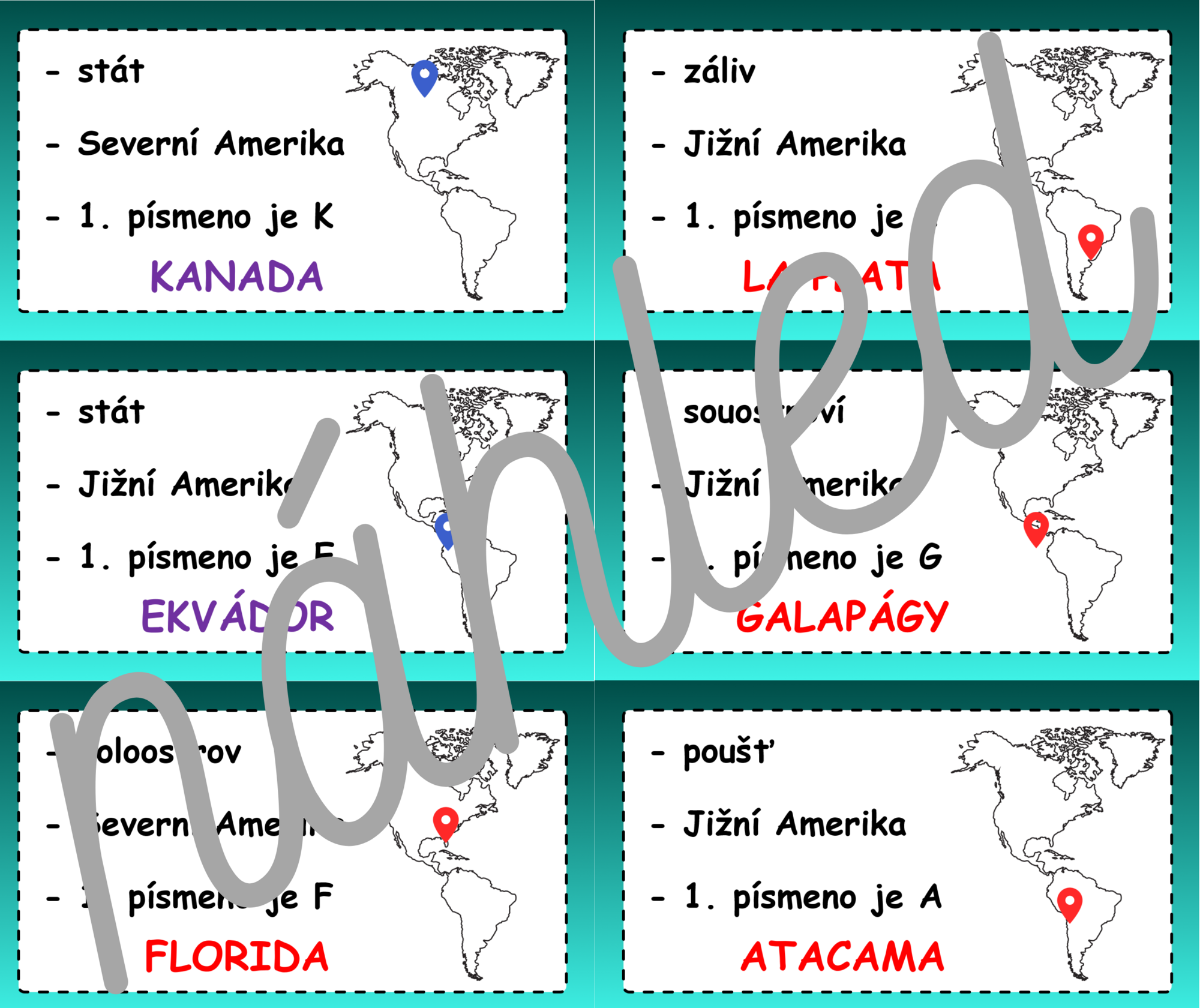 Aktivita slouží k rychlé, interaktivní rozcvičce - ideálně na úvod k probíraného světadílu (Amerika) nebo kdykoliv ke zpestření začátku/konce vyučovací hodiny. Osobně používám materiál také na začátku 6. třídy při seznámení s mapou a atlasem.