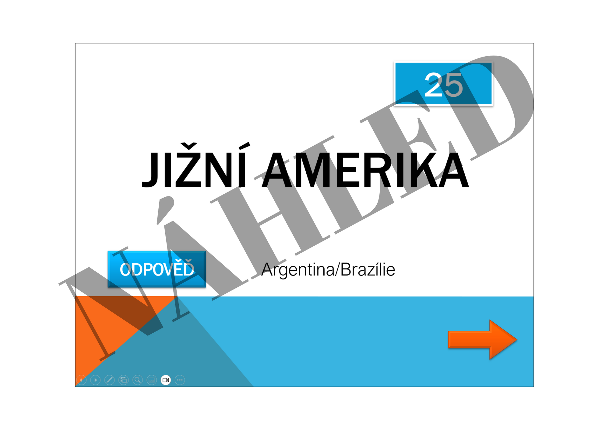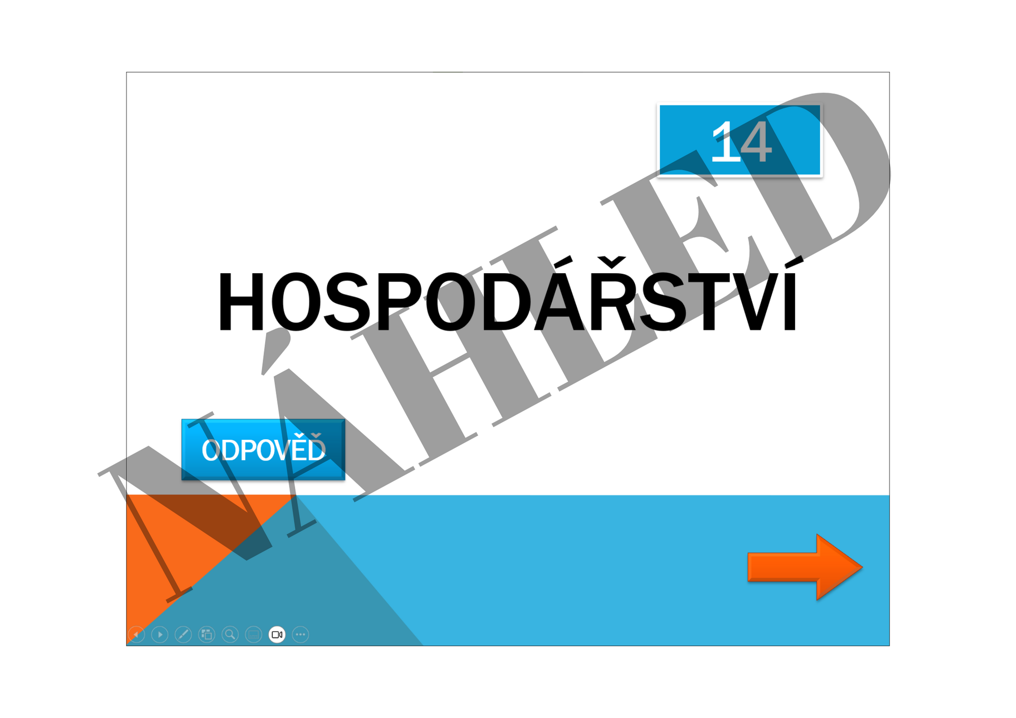 Prezentace obsahuje klasická políčka, na která když kliknete, dostanete se na snímek s číslem otázky a tematickým okruhem, ze kterého vyučující otázku pokládá. Odpověď se zobrazuje přímo v prezentaci po kliknutí na příslušné tlačítko. Po navrácení se od konkrétní otázky k políčkům, je možné políčka obarvit oranžovou nebo modrou barvou.