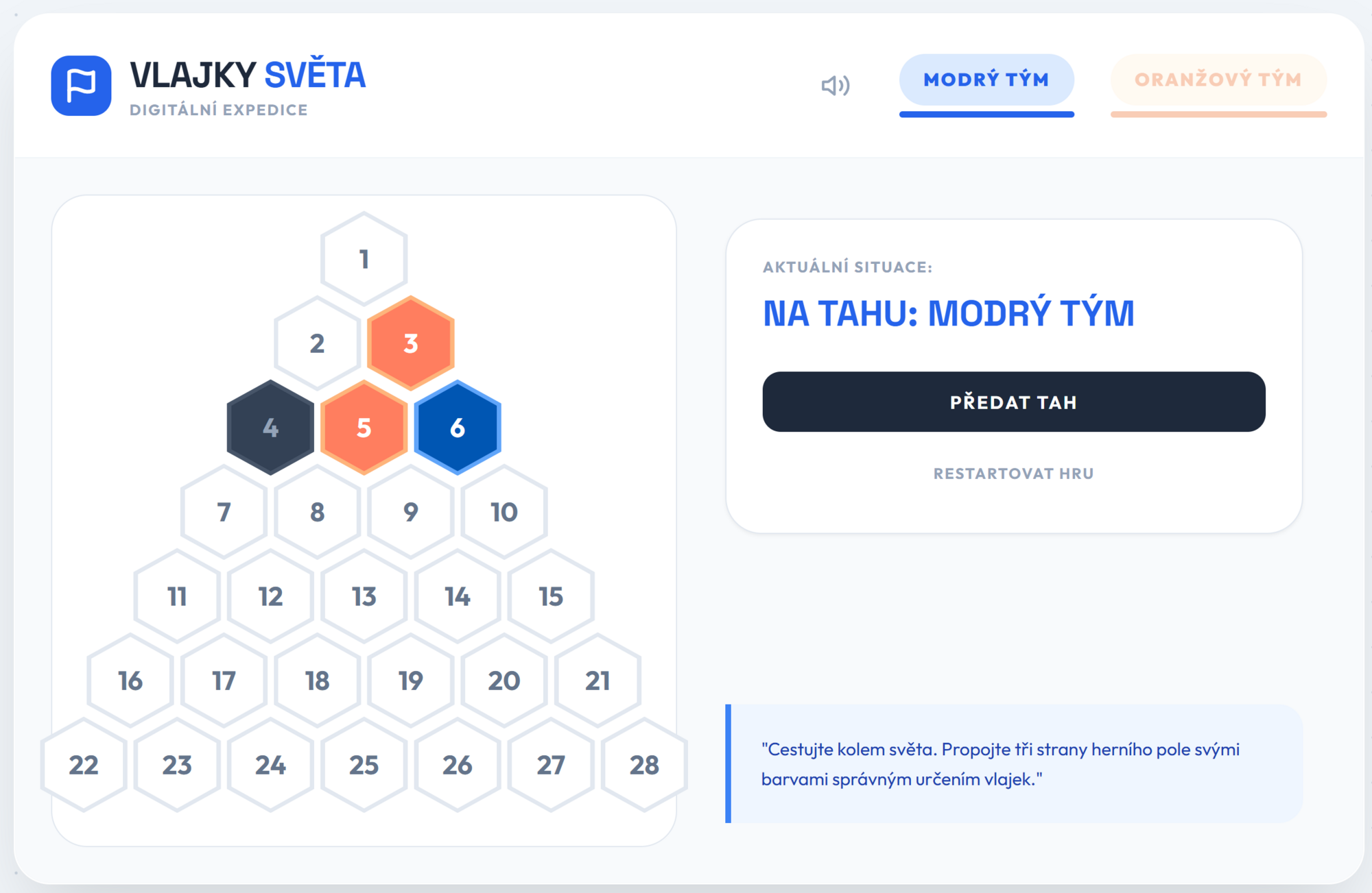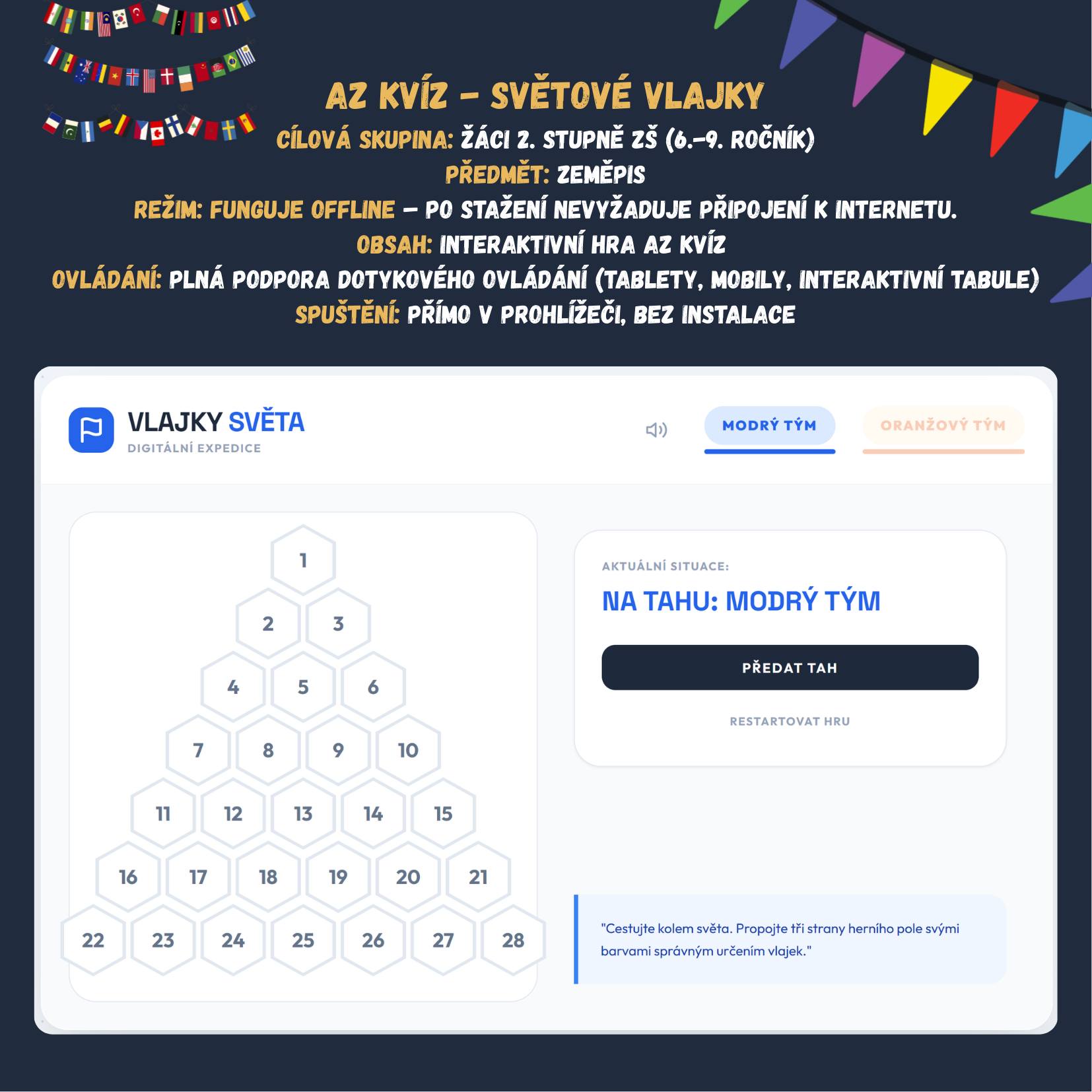 Hledáte moderní a napínavý způsob, jak s žáky procvičit zeměpis? Tato interaktivní hra přenáší oblíbený formát televizní soutěže přímo do vaší třídy! Žáci se vydají na digitální expedici, kde k vítězství nepotřebují jen znalosti o státech a jejich symbolech, ale také správnou strategii.