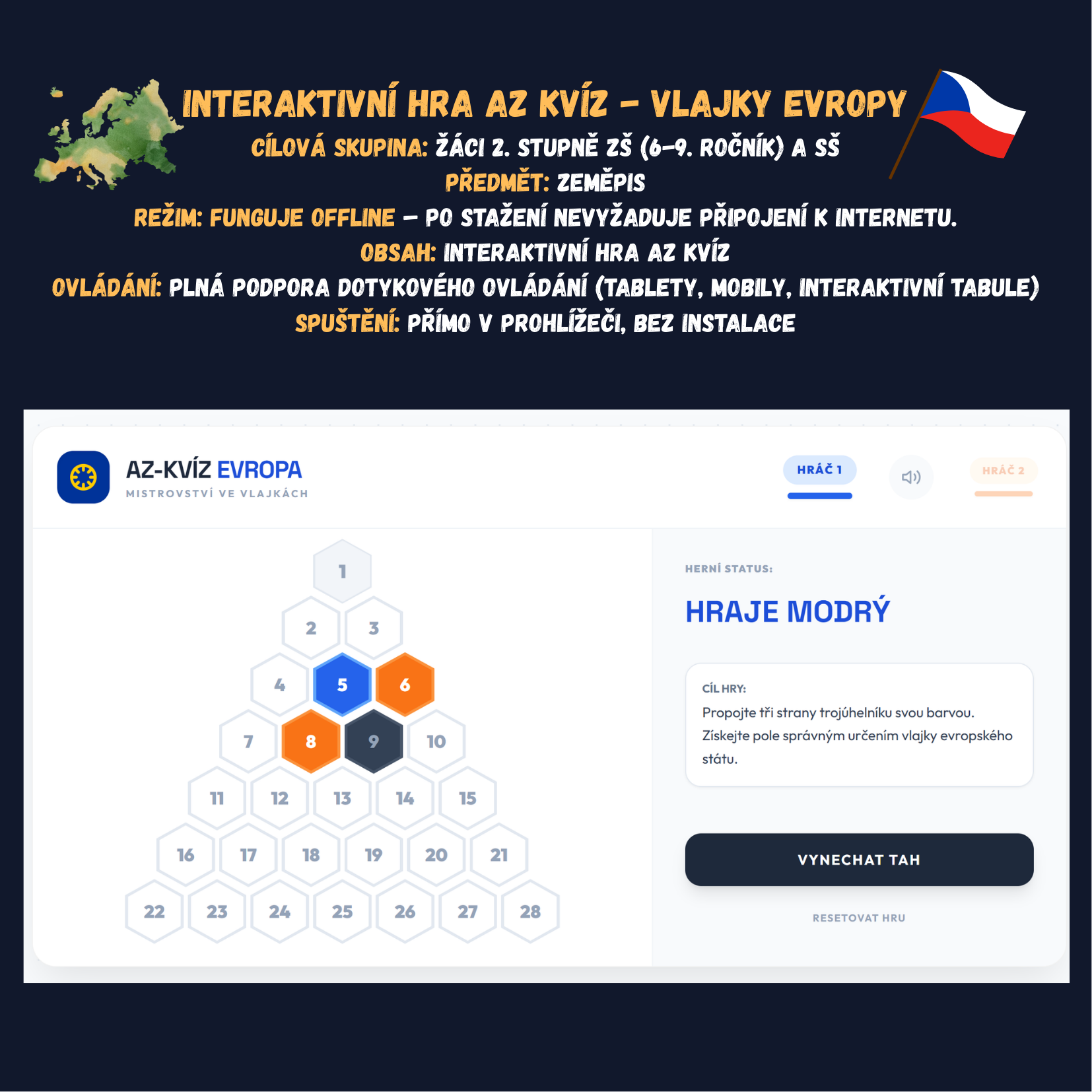 - Technická jednoduchost: Stačí otevřít v prohlížeči. Funguje na interaktivních tabulích, PC i tabletech a po stažení nevyžaduje internet.