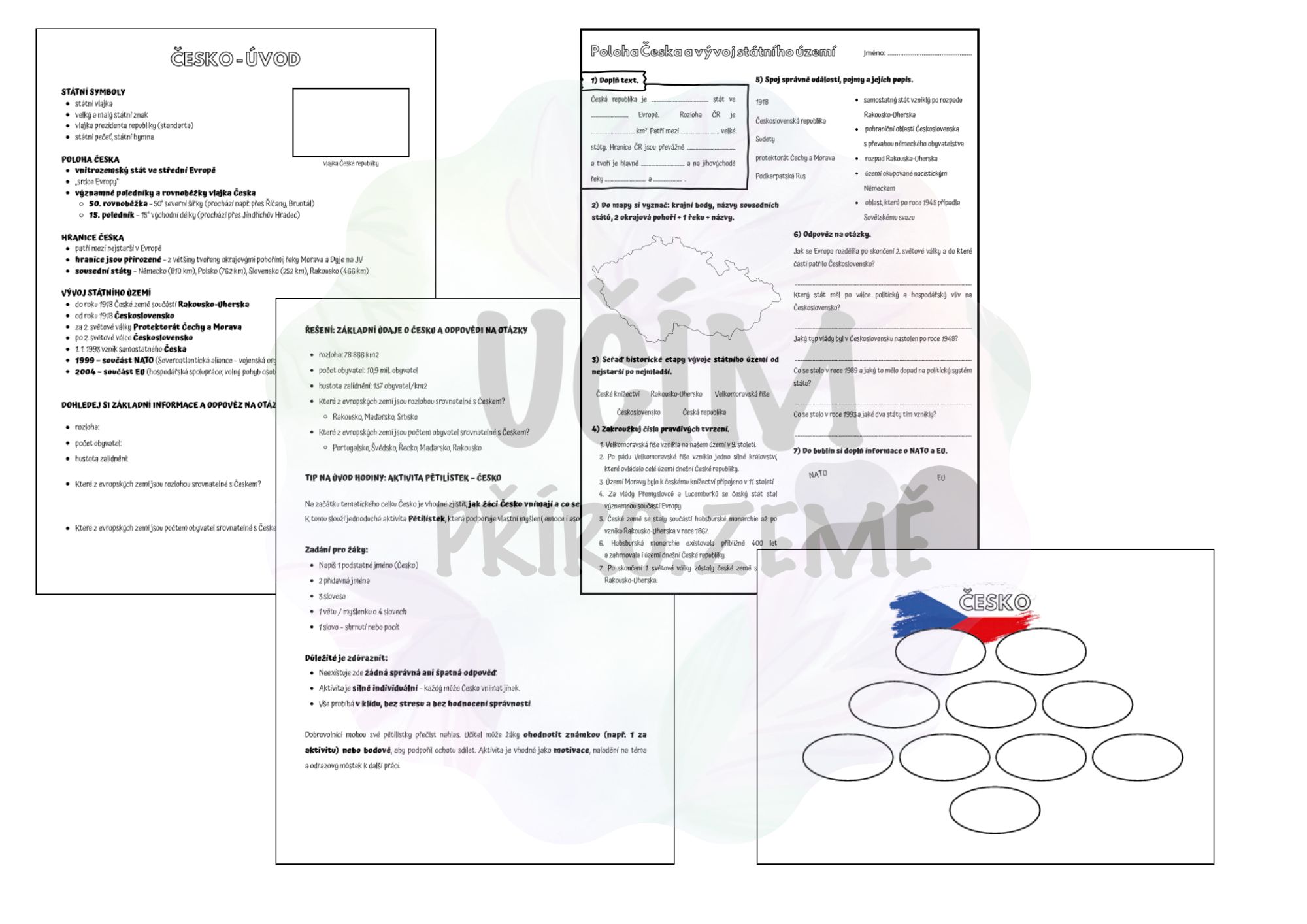 Tento materiál nabízí přehledný a smysluplný úvod k tematickému celku Česko. Kombinuje shrnutí k nalepení do sešitu, tipy na aktivizační a badatelské aktivity a pracovní list s řešením.