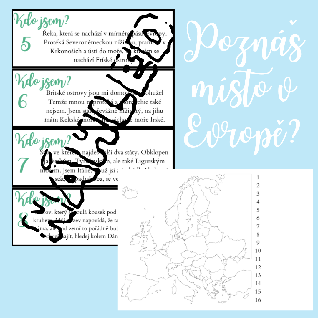 - Záznamový list s mapou: Slepá mapa Evropy se seznamem čísel pro možnost zapojit zakreslení do slepé mapy.