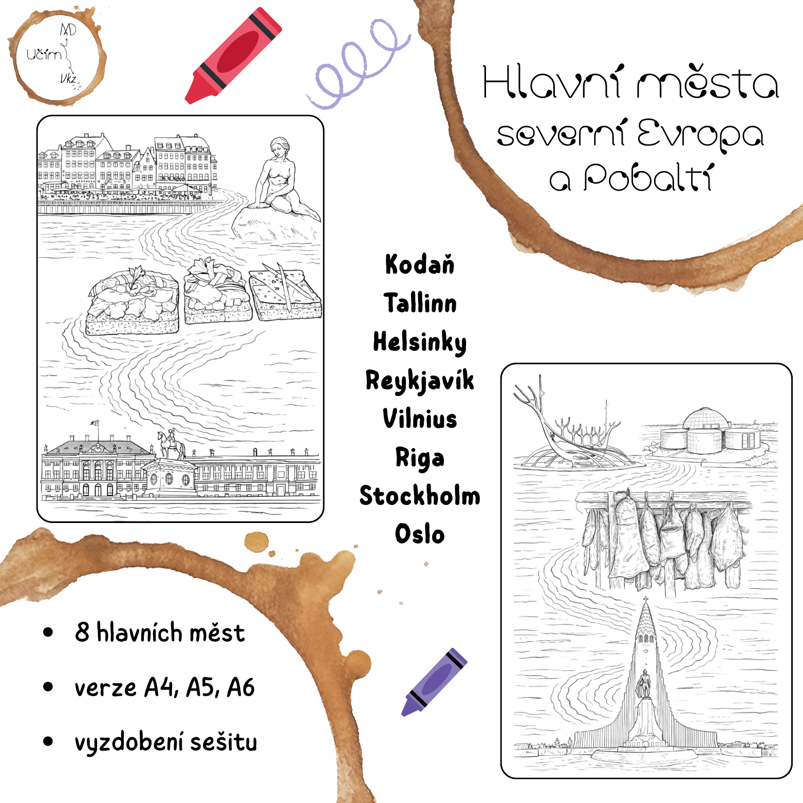 Materiál je určený pro žáky základní školy jako doplnění zápisků do sešitu. Obsahuje 8 omalovánek hlavních měst severní Evropy a Pobaltí, jejich nejznámější památky, jídlo či pití. Obsahuje řešení pro učitele. Verze A4, A5 i A6.